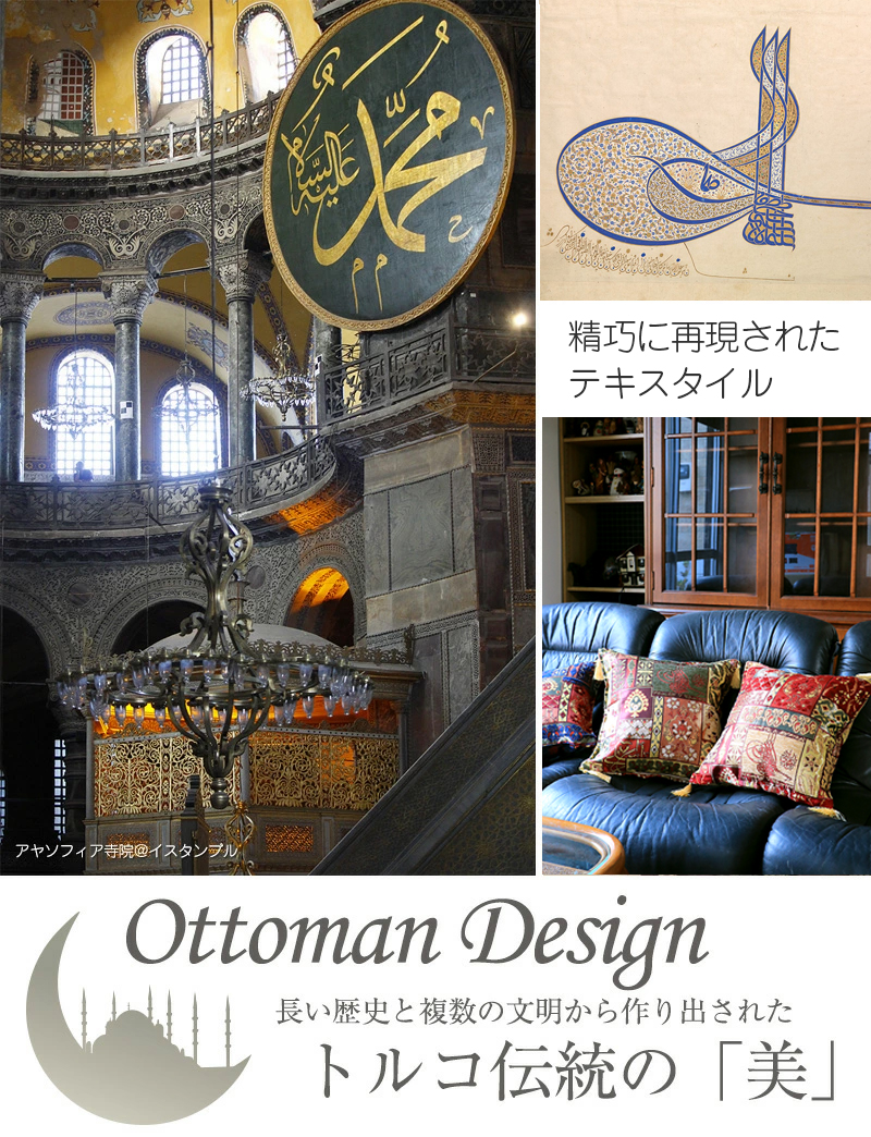 このスルタンの紋章をポイントに使ったエスニックなファブリックのクッションカバーです。ゴージャスなデザインで、ちょっぴりスルタンの気持ちが味わえます。