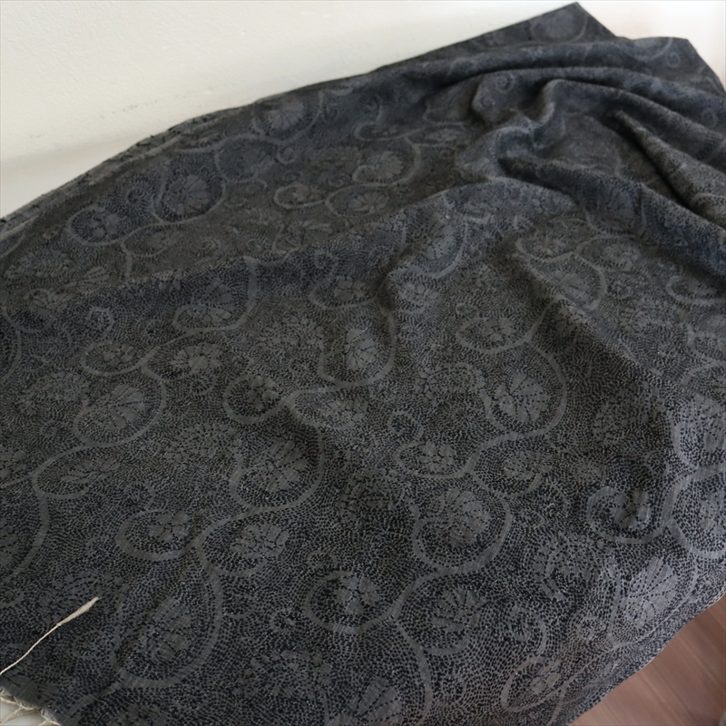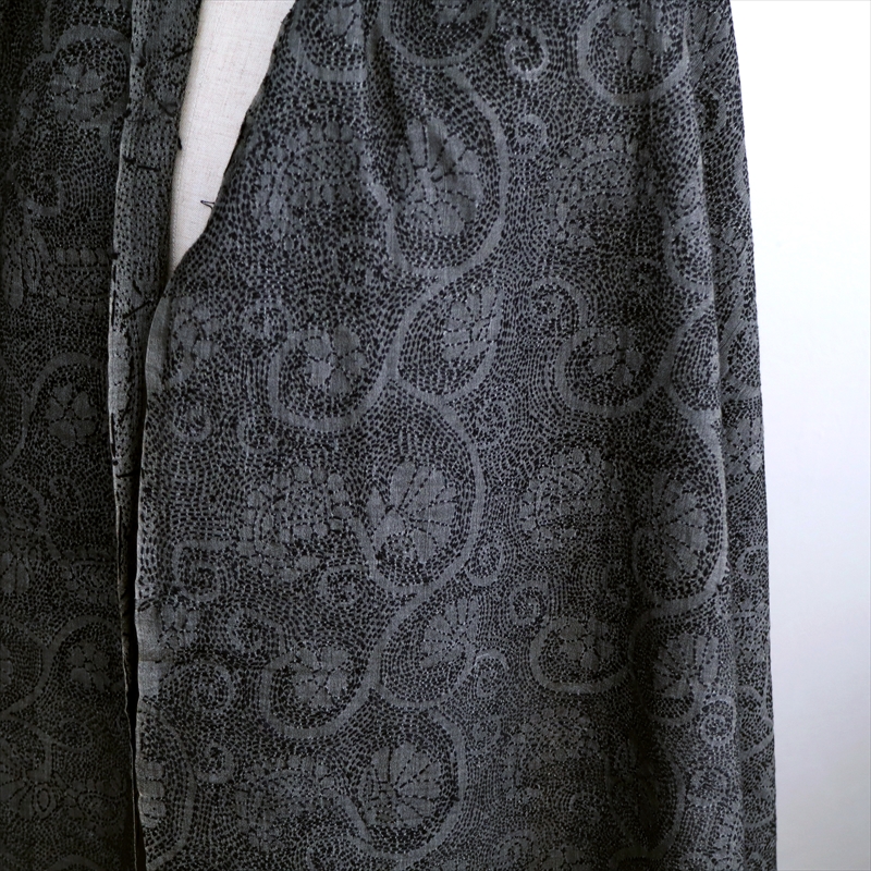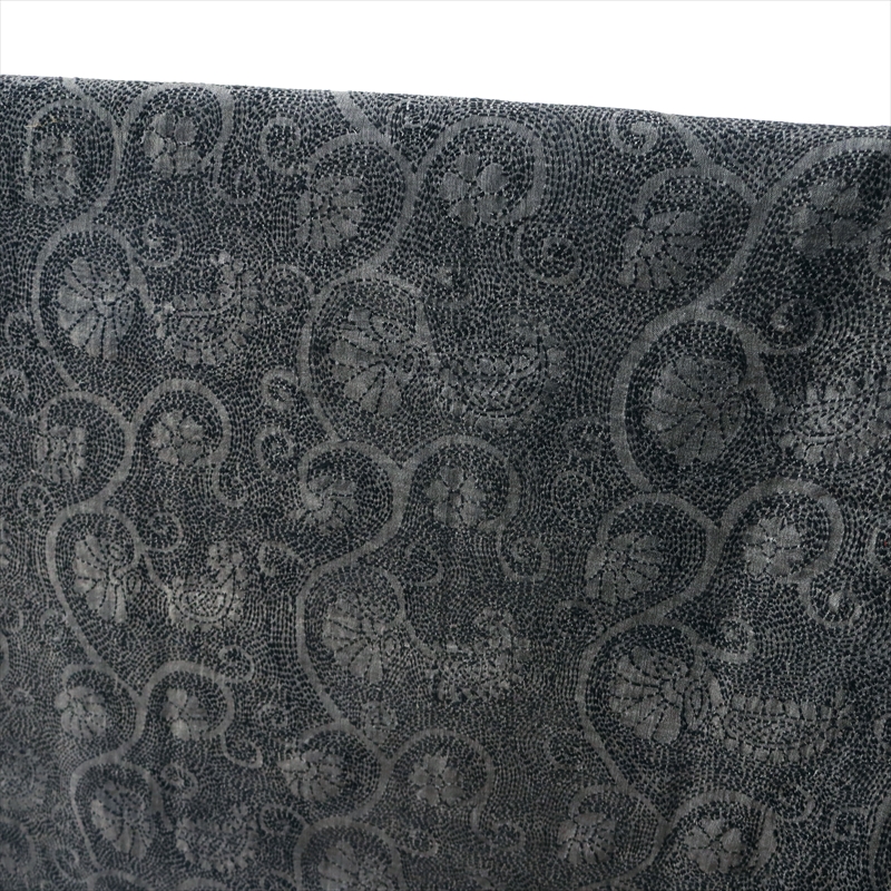 光沢のあるダークグレーのシルク地の全面が、細かな刺繍で埋めつくされています。デザインは花と葉が連なるボタニカルモチーフ。モチーフ部分がベース生地のままで、モチーフの隙間を埋めているのがすべて刺繍になっていて、とても凝ったデザインです。