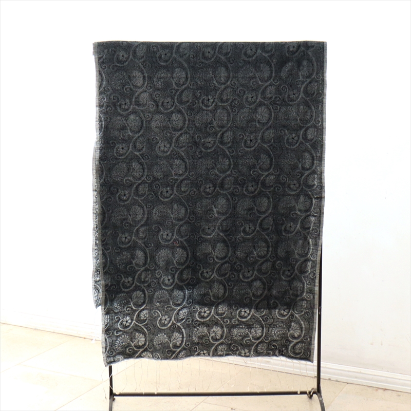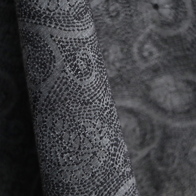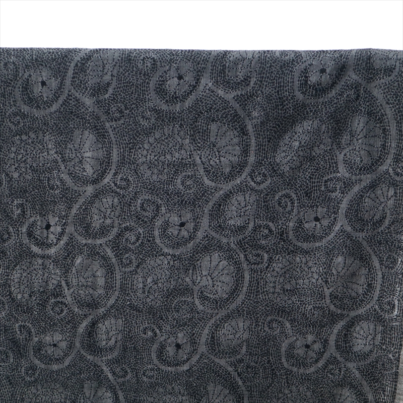 光沢のあるダークグレーのシルク地の全面が、細かな刺繍で埋めつくされています。デザインは花と葉が連なるボタニカルモチーフ。モチーフ部分がベース生地のままで、モチーフの隙間を埋めているのがすべて刺繍になっていて、とても凝ったデザインです。