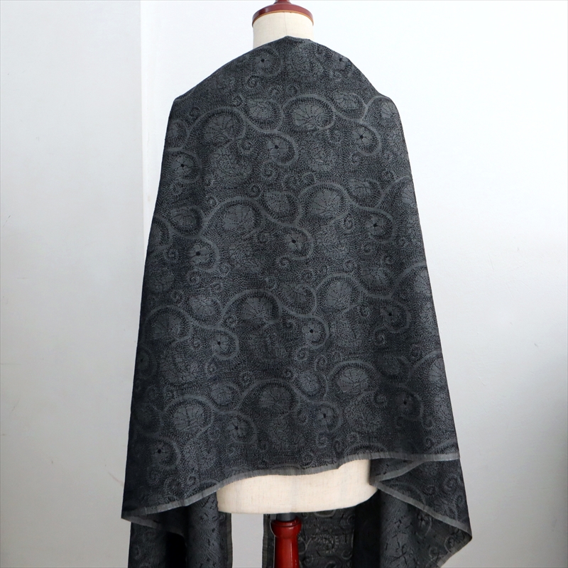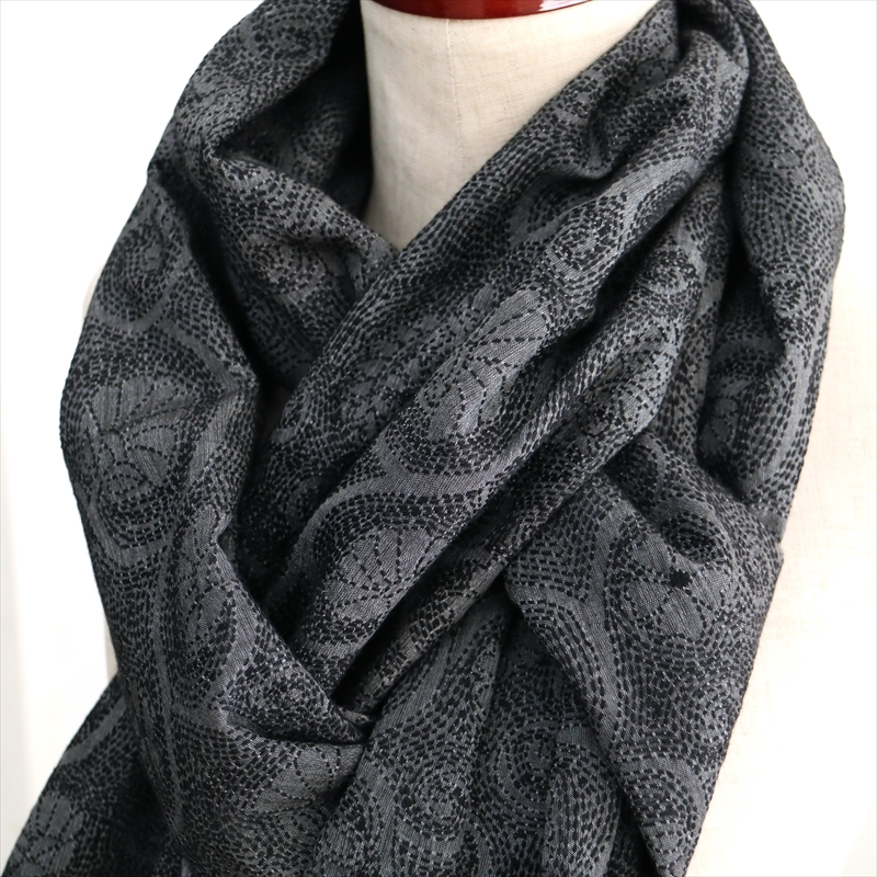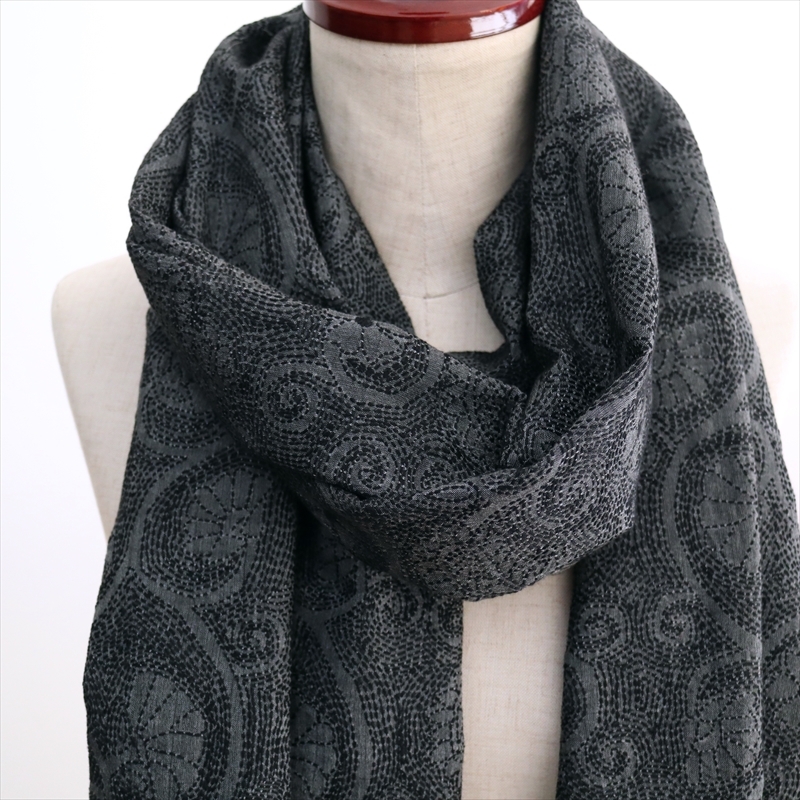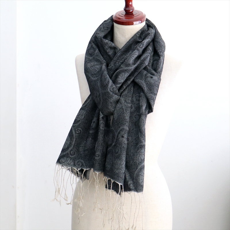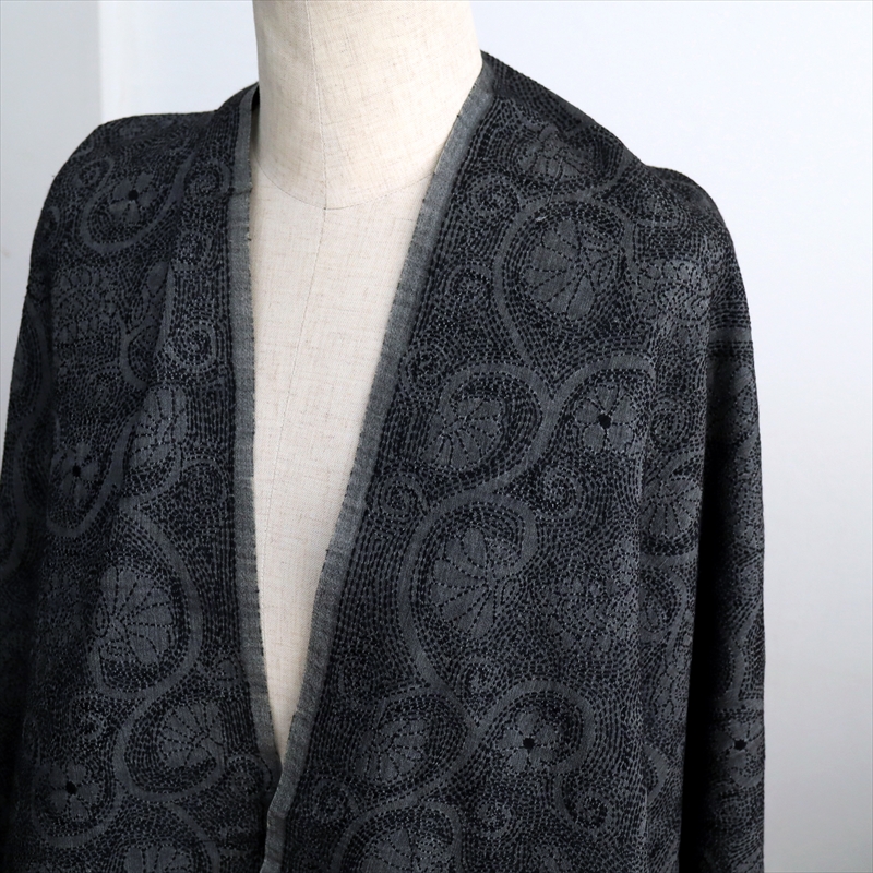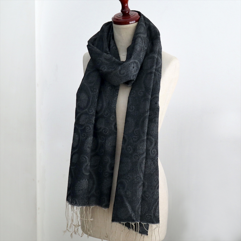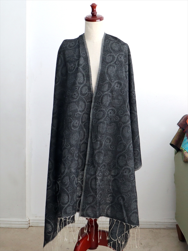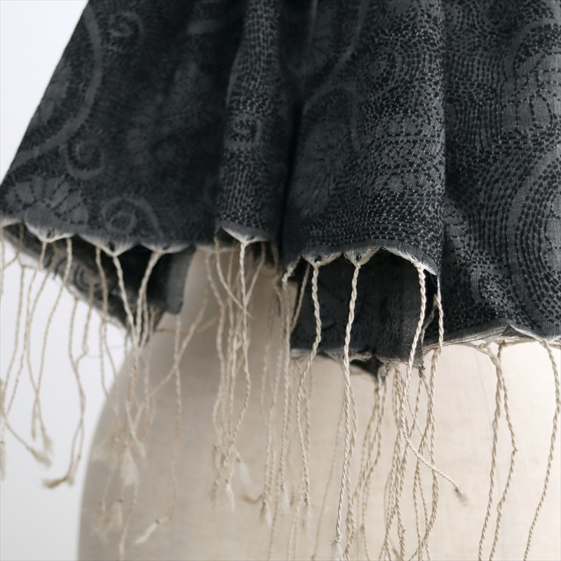 - シルクストール 大判ストール 手刺繍 214×72cm カンタ刺繍 ブラック