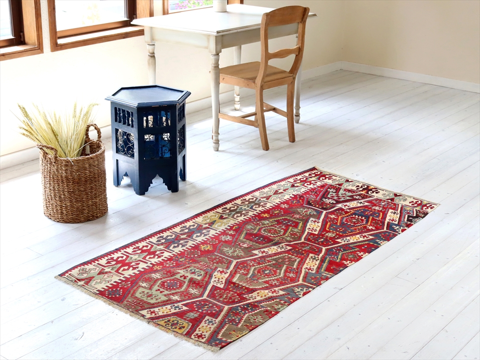 大型のキリムからカットされたフラグメント。レッドのフィールドには連なるようにエリベリンデのモチーフが描かれています。モチーフひとつひとつが細かくていねいに織られていて、織り子さんの手仕事を堪能できる1枚です。
