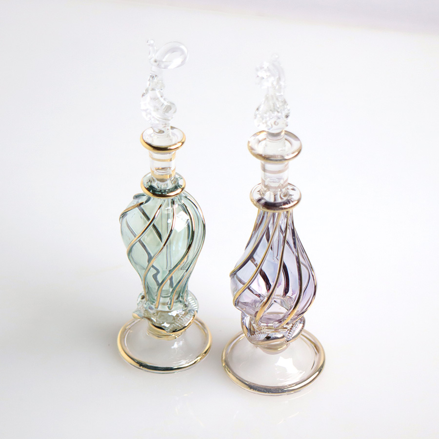 5. エジプト ガラス香水瓶 11cm 2本セット ゴールドライン ファラオ ユニークなボトルキャップ