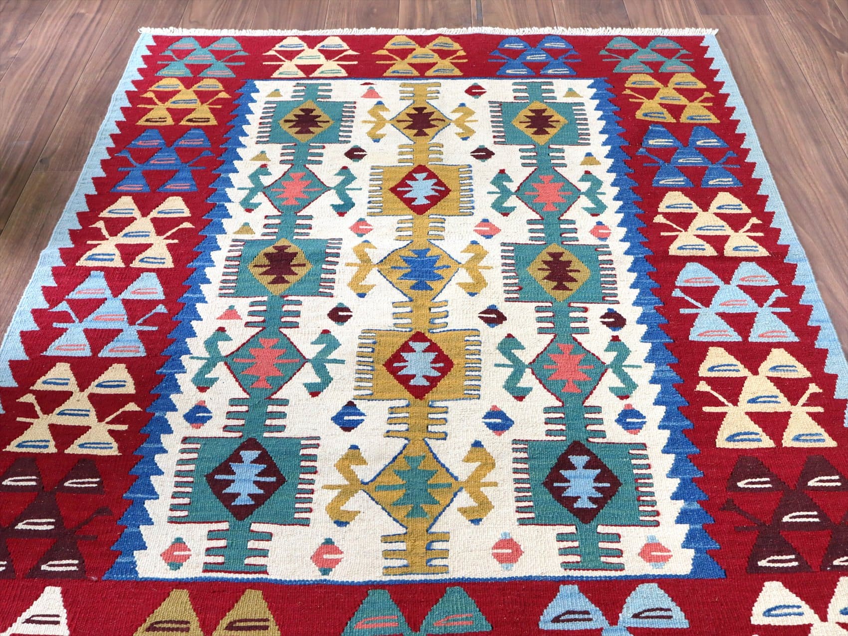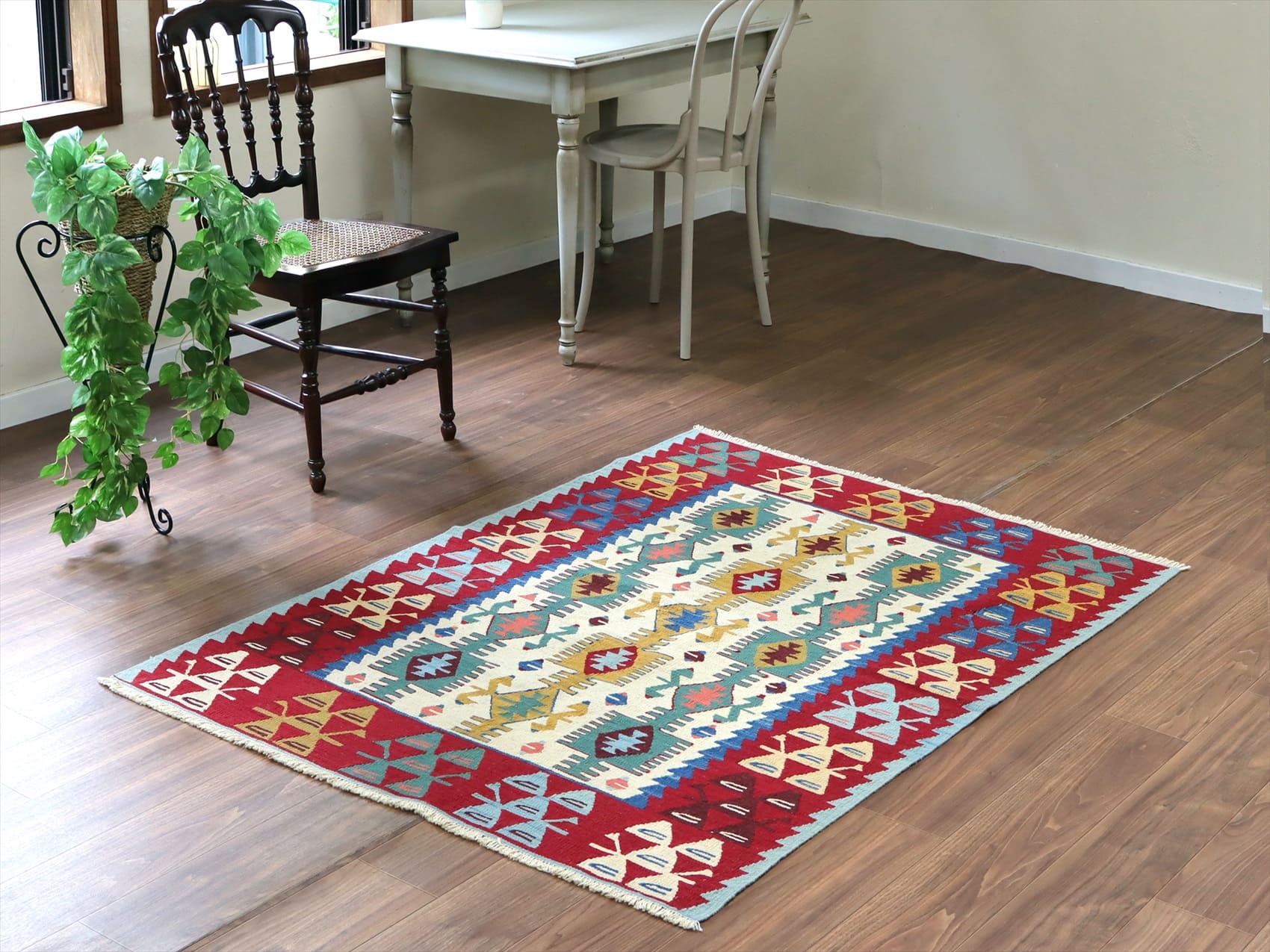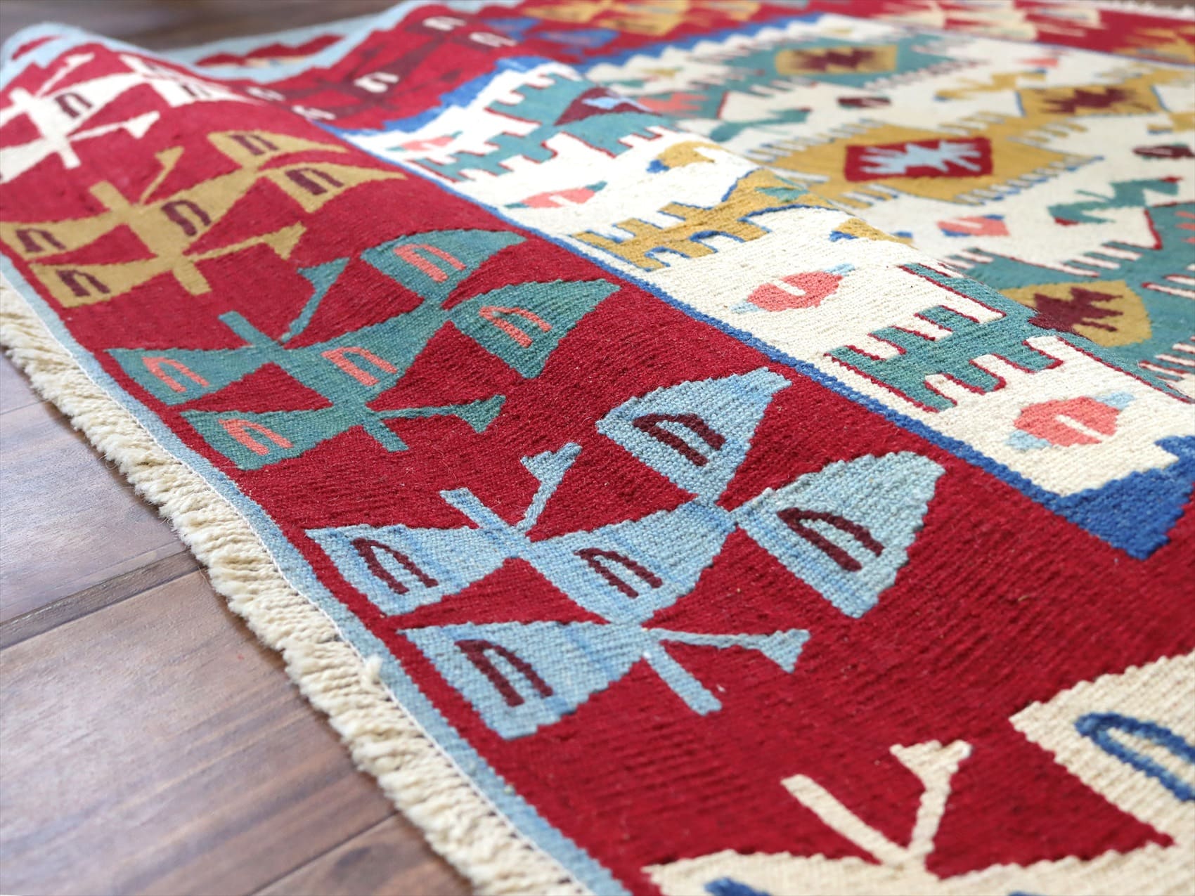 発色がよく鮮やかな色使いのウシャクキリム。ボーダーのレッドが力強く、引き締まったデザインに。