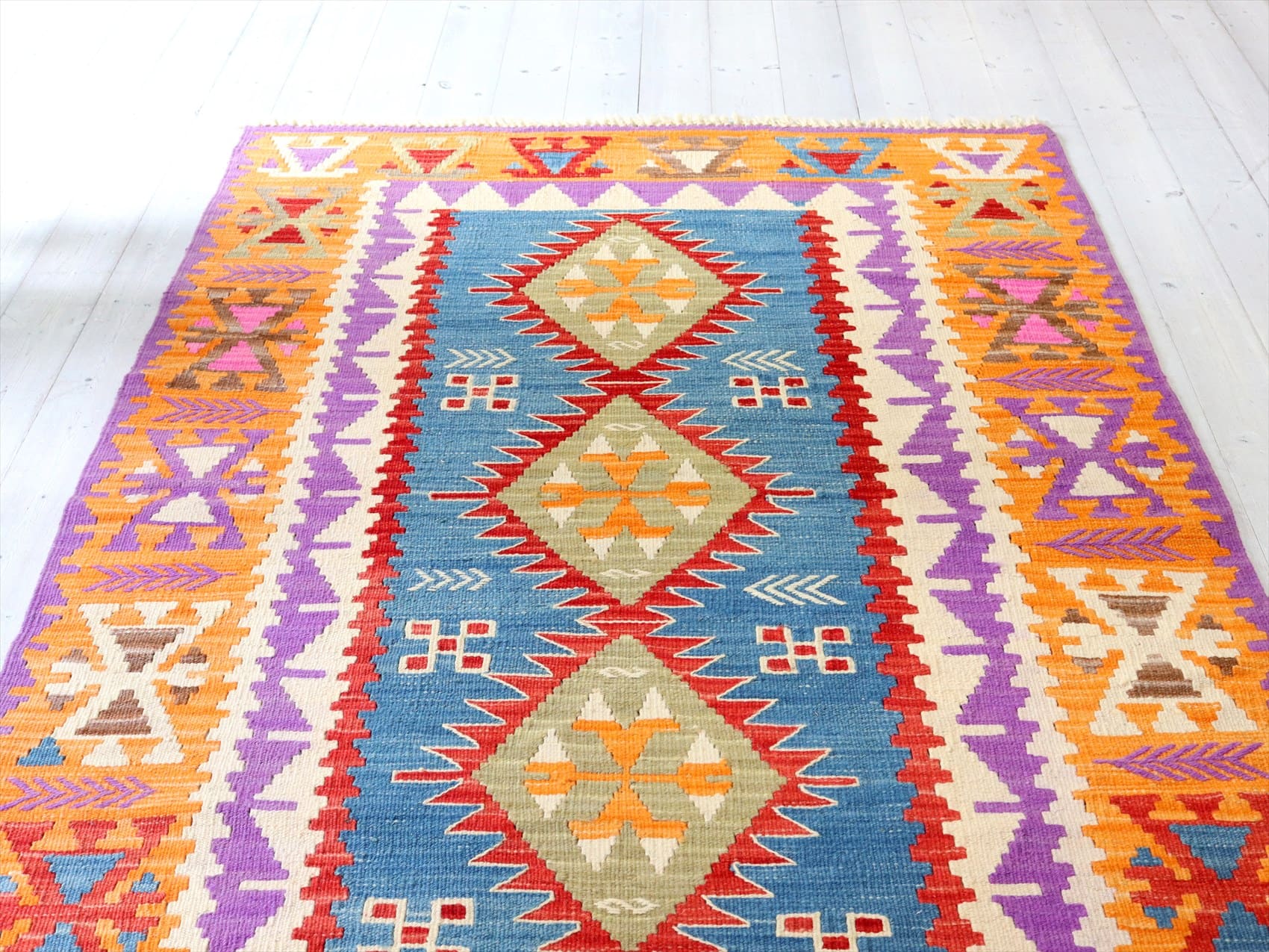織り地がしなやかでやわらかいのがカイセリキリムの特徴です。やや厚みがあり、やさしい肌触り。色の切り替え部分には、キリムの織りの特徴で、縦に隙間が開いています(スリットと呼んでいます)。