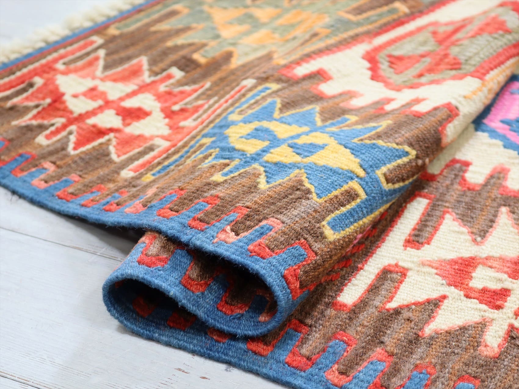 織り地がしなやかでやわらかいのがカイセリキリムの特徴です。やや厚みがあり、やさしい肌触り。色の切り替え部分には、キリムの織りの特徴で、縦に隙間が開いています(スリットと呼んでいます)。