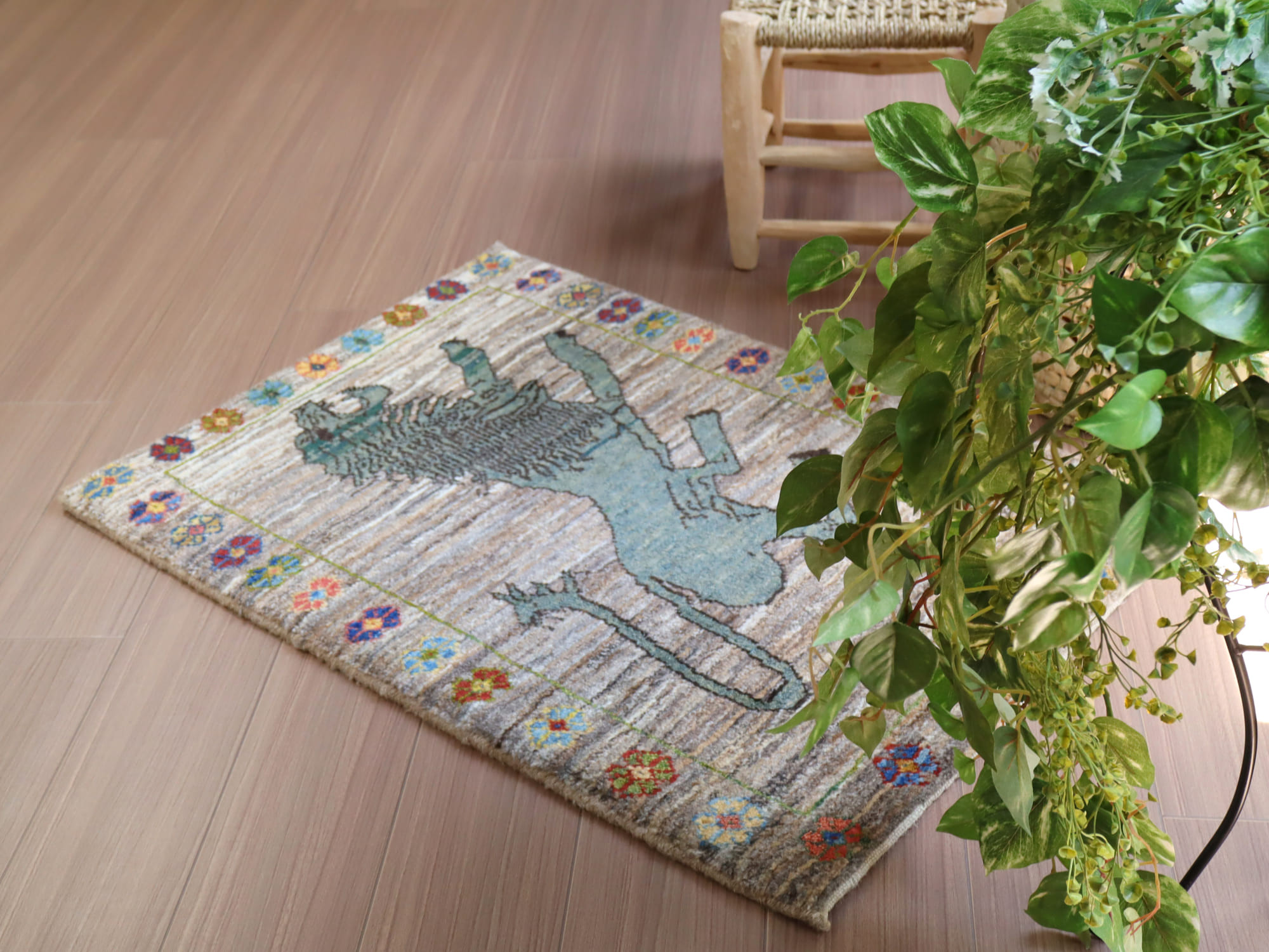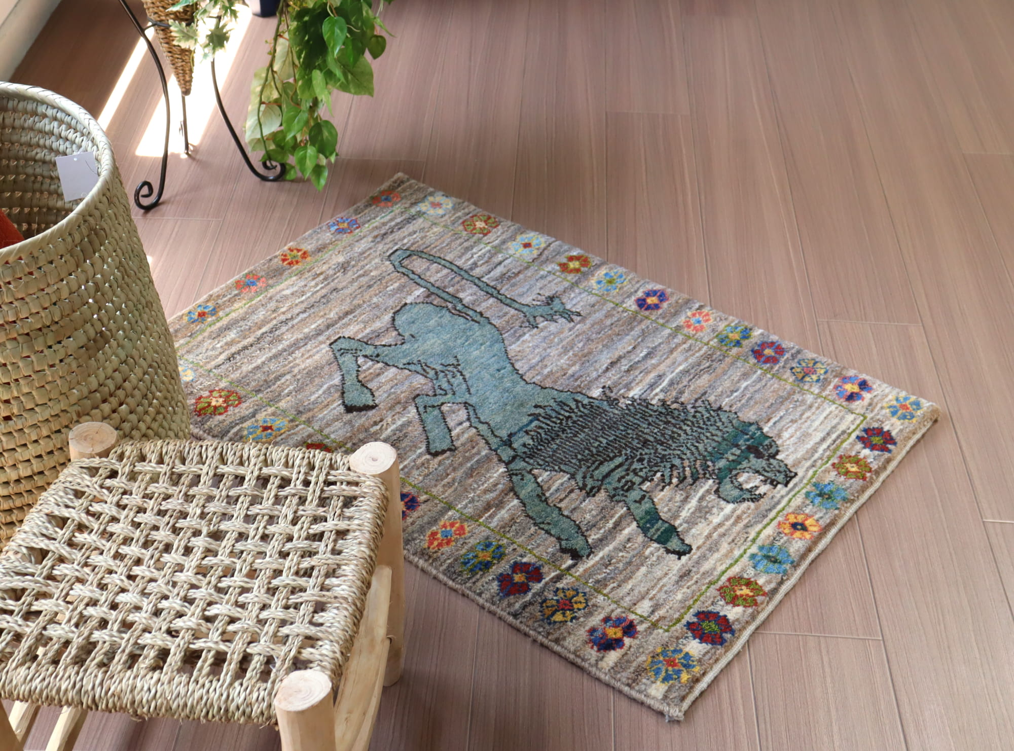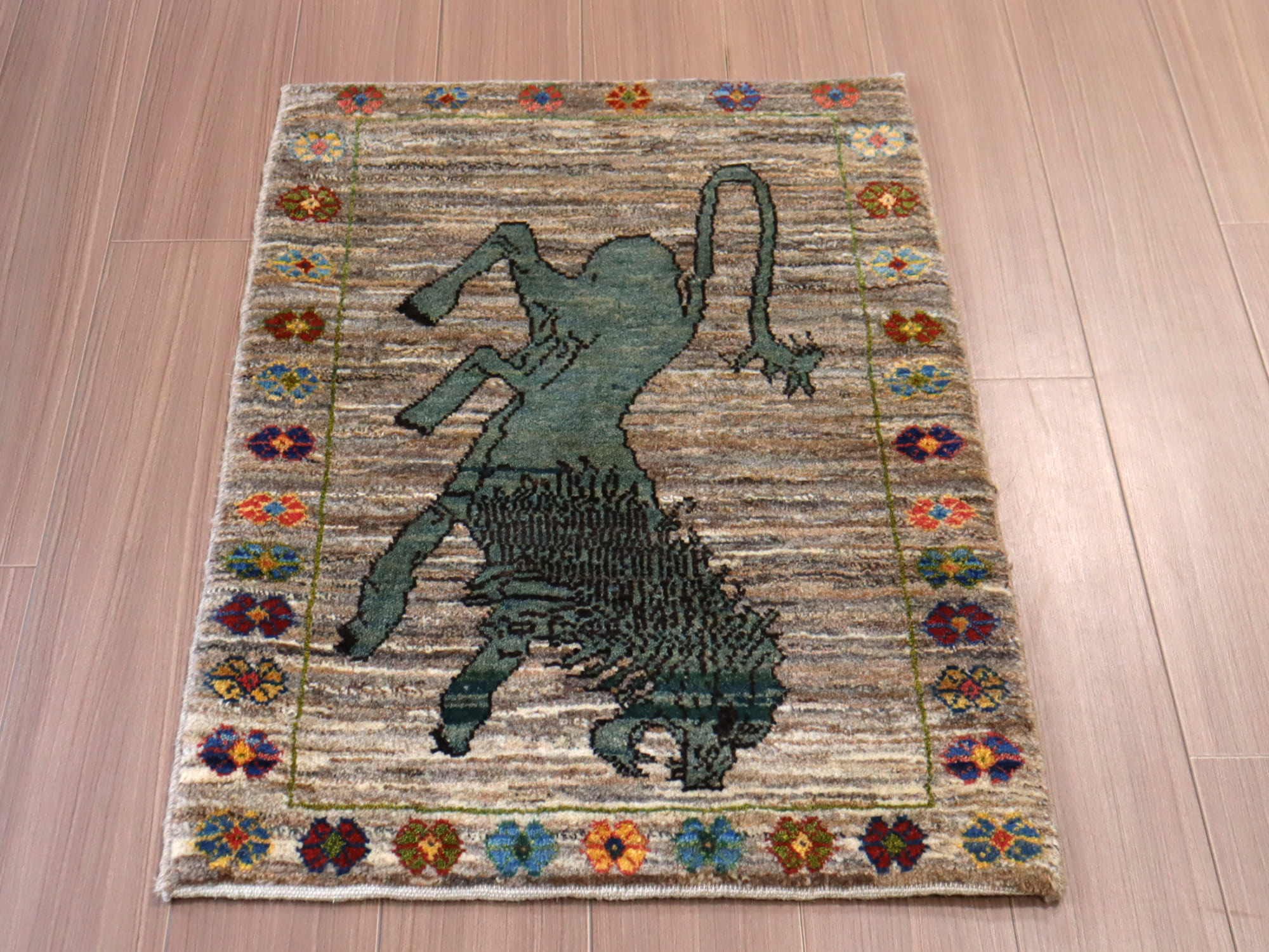 Key:Gabbeh, Lion rug, Tribal rug, ライオンギャッベ, ラグ, ギャッベ, ギャベ, 部族絨毯, トライバルラグ, コレクタブル, ウール製, イラン, ペルシャ, 手織り, じゅうたん, 絨毯, グレー, ブルーグリーン