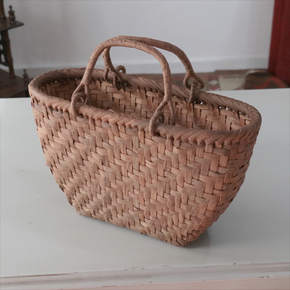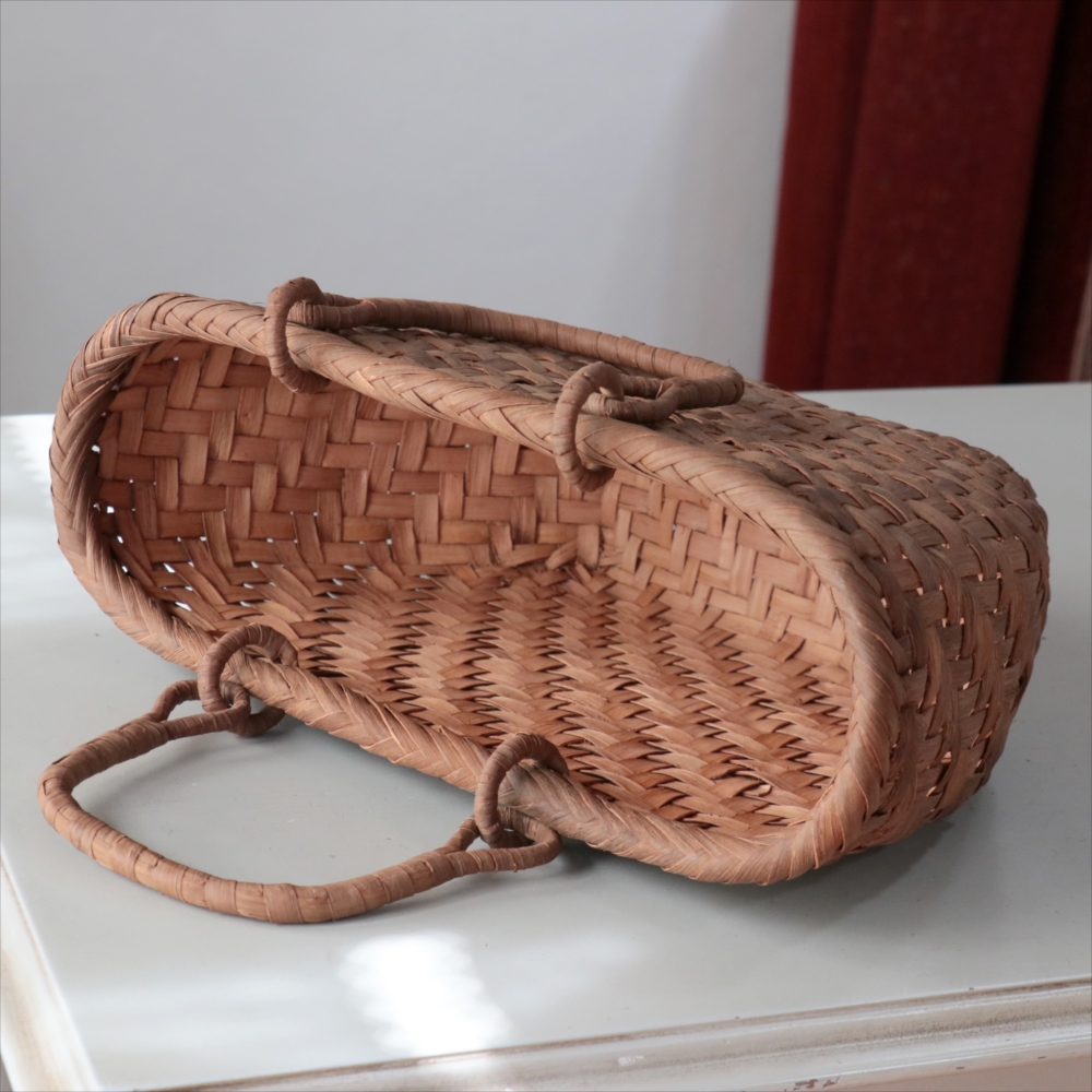マルシェバッグと名づけられた大きめのやまぶどうのかごです。左右の曲線がきれいな仕上がりで、安定感もあります。持ち手は稼働式のリング手で、実用的。内布はないタイプなので、自分の好きな生地で巾着や風呂敷包みを入れたりして、アレンジしてお使いいただくのがおすすめです。