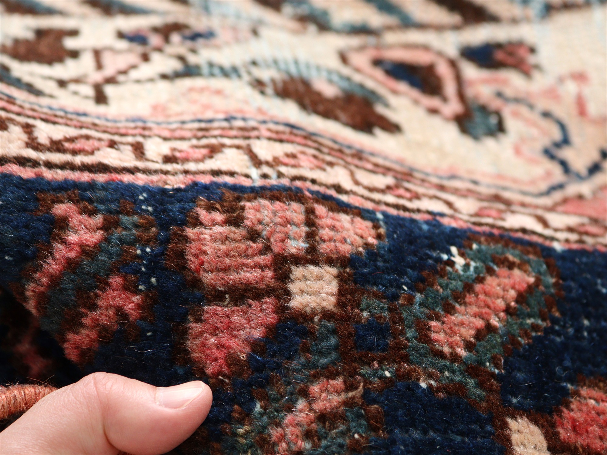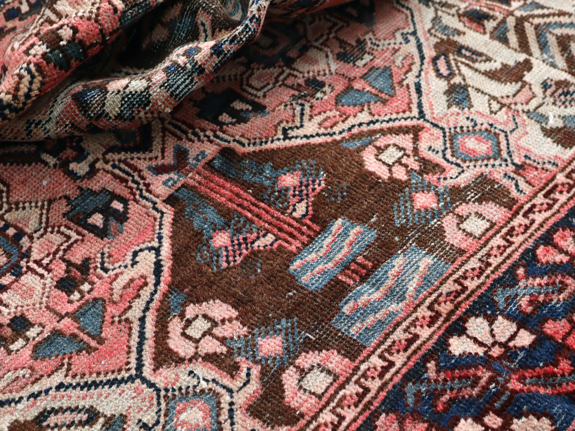 全体のカタチにゆがみがあるほか、表面のパイル(毛足)に擦り切れている部分が広範囲にあります。使い古した雰囲気を楽しめるよう、修理はなく写真の状態でお届けです。じゅうたんの経糸はしっかり残っているので、まだまだ長くお使いいただけます。