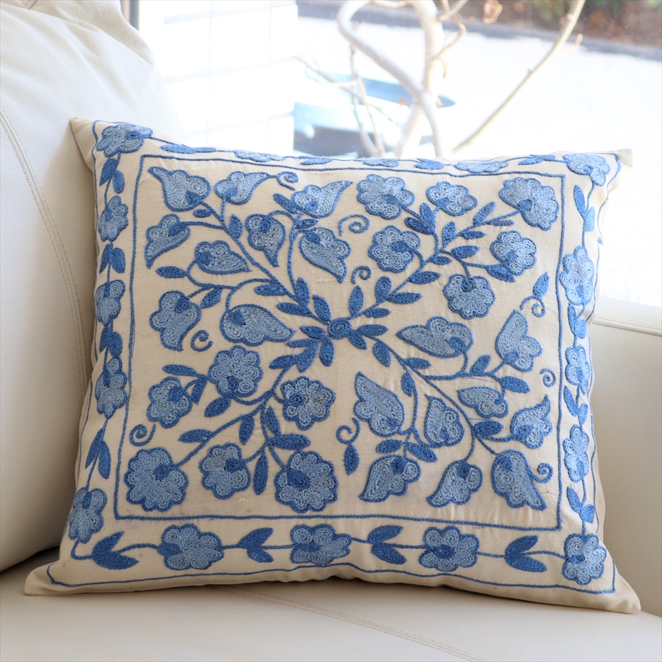 スザンニ クッションカバー/ウズベキスタン シルクの手刺繍 45×40cm ブルーの花模様