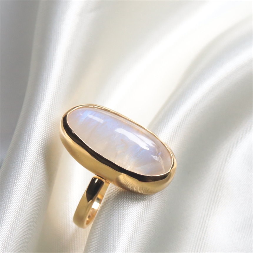 幻想的で奥行のある輝きが魅力のレインボームーンストーンのリングです。角度を変えるたび、乳白色の石の中に鮮やかなブルーのシラーが浮かび上がります。ぷるんとした縦長のオーバルフォルムは、指をほっそりと長く見せてくれる嬉しい視覚効果があります。