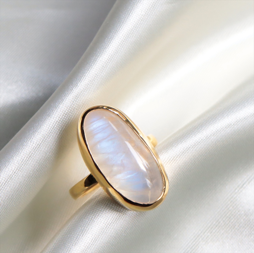 - レインボームーンストーン シルバーリング 大粒 縦長オーバル 18KGF 天然石 トルコジュエリー カラーストーン
