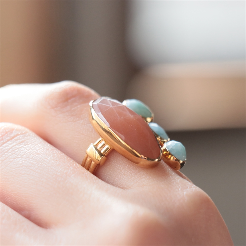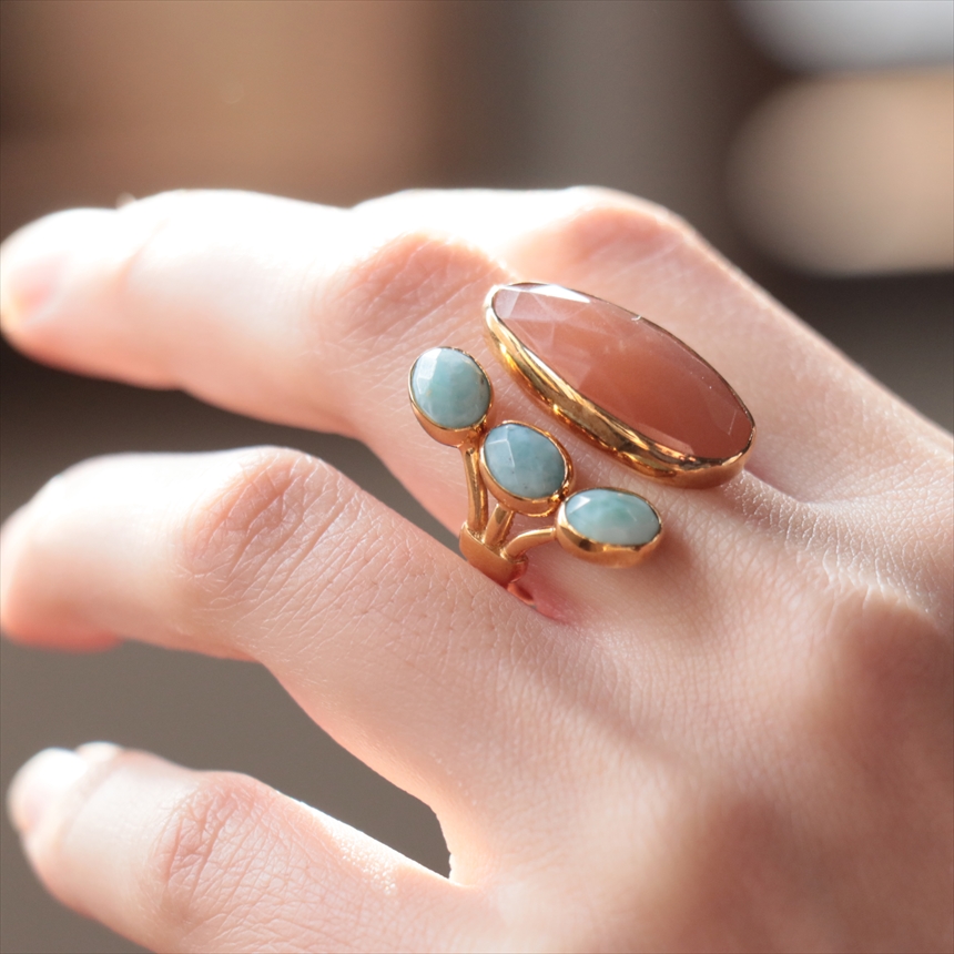 Key:Turkish Jewelry, Color stone,イスタンブールジュエリー, トルコジュエリー, シルバージュエリー,ゴールドコーティング,上質, 天然石,リング,ひと粒,ガラタバザール,ハンドメイド,カラーストーン,きれいめ,大人女子,一点物,色石,輸入雑貨,トルコ,ニュアンスカラー,プレゼント,ラリマー,3粒,サンストーン