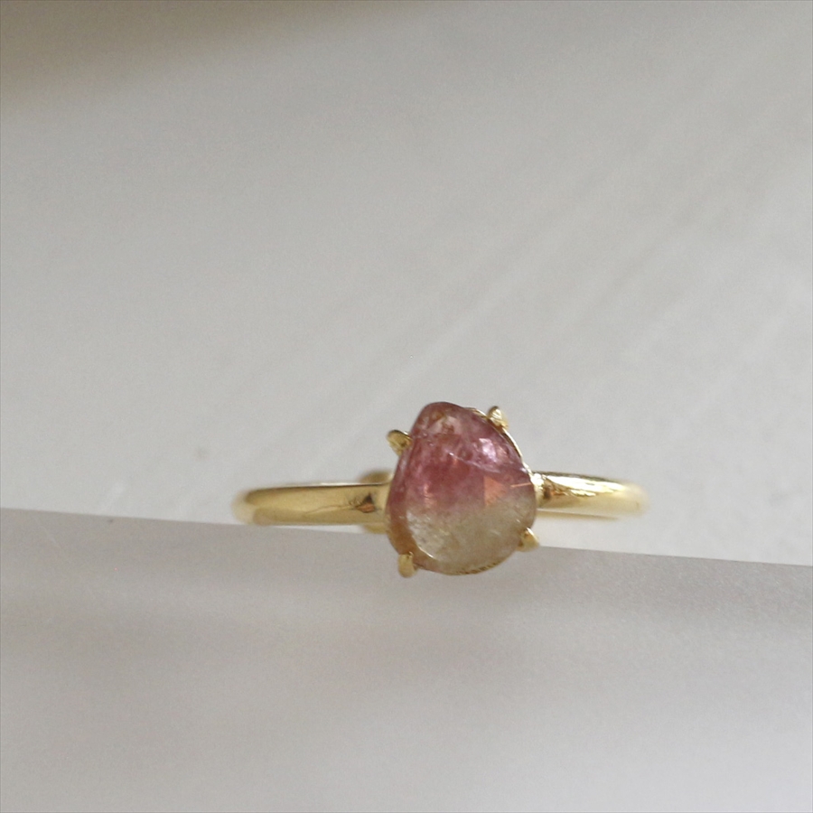 ラフにカットされたウォーターメロントルマリンの一粒リング。指にちょこんと乗るようなかわいらしいサイズながらも、ローズカットが施され、つぼみの様な立体感のあるデザインです。ウォーターメロントルマリンとは、その名の通り、スイカのように外側がグリーンで、内側が赤いピンクの配色からなるバイカラートルマリンのことをいいます。爪留めデザインは周りからたくさんの光がさすので、石のそのままの美しさを引き立てます。