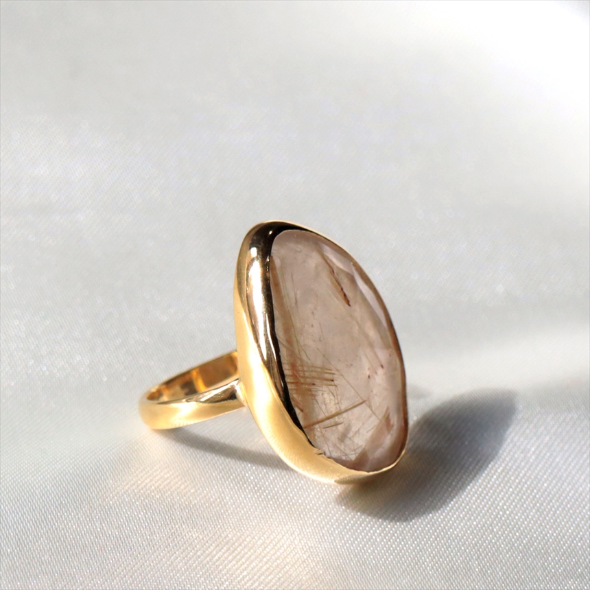 クリアなクォーツの中に繊細なゴールドの針(ルチル)が閉じ込められた、自然が生んだ神秘ともいえる、ルチルクォーツのリングです。肌に溶け込むヌーディーな色調にゴールドが煌めき、手元をより洗練された知的な印象にみせてくれます。