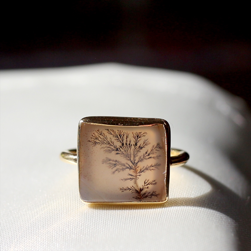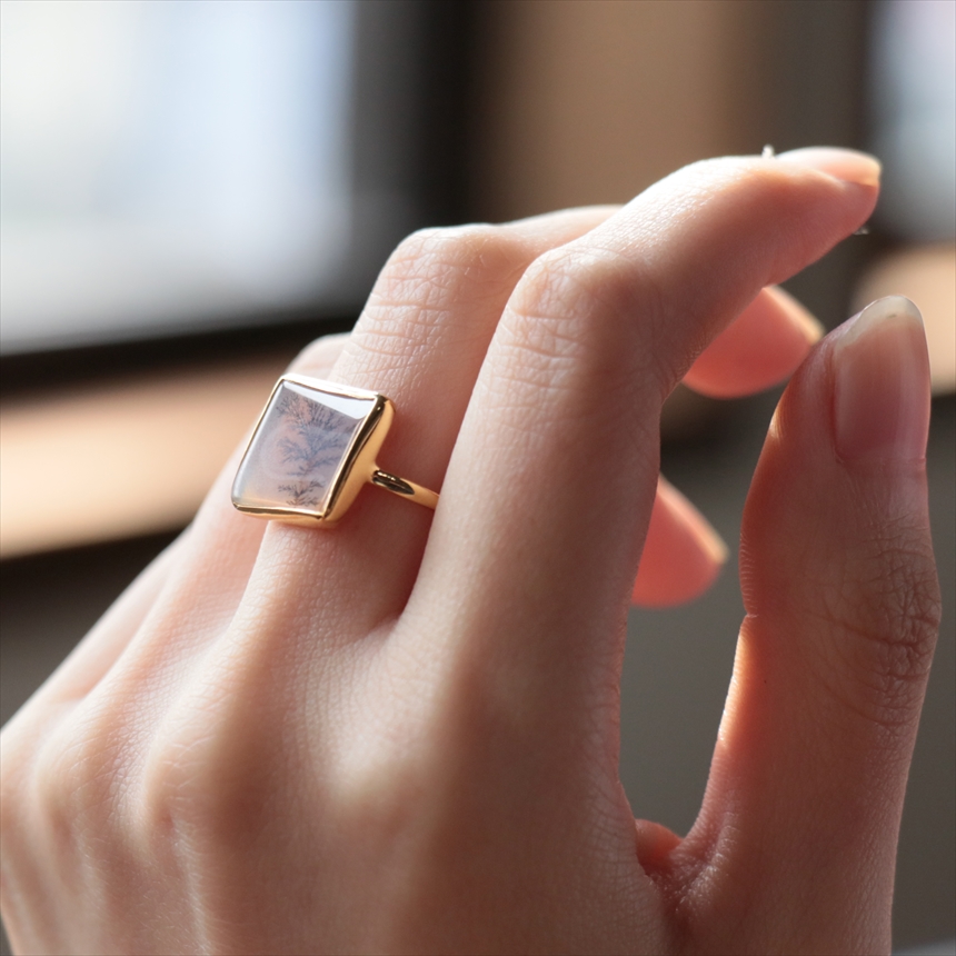 やわらかな乳白色の水晶の中にシダ植物のような模様(内包物)が広がるデンドライトのリングです。一粒ごとに異なる絵画のような天然石の表情が、手元を見るたびに深い癒やしを与えてくれます。