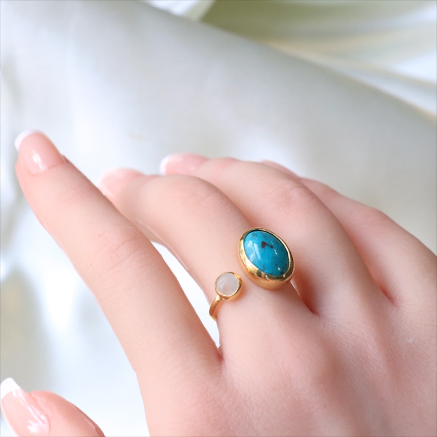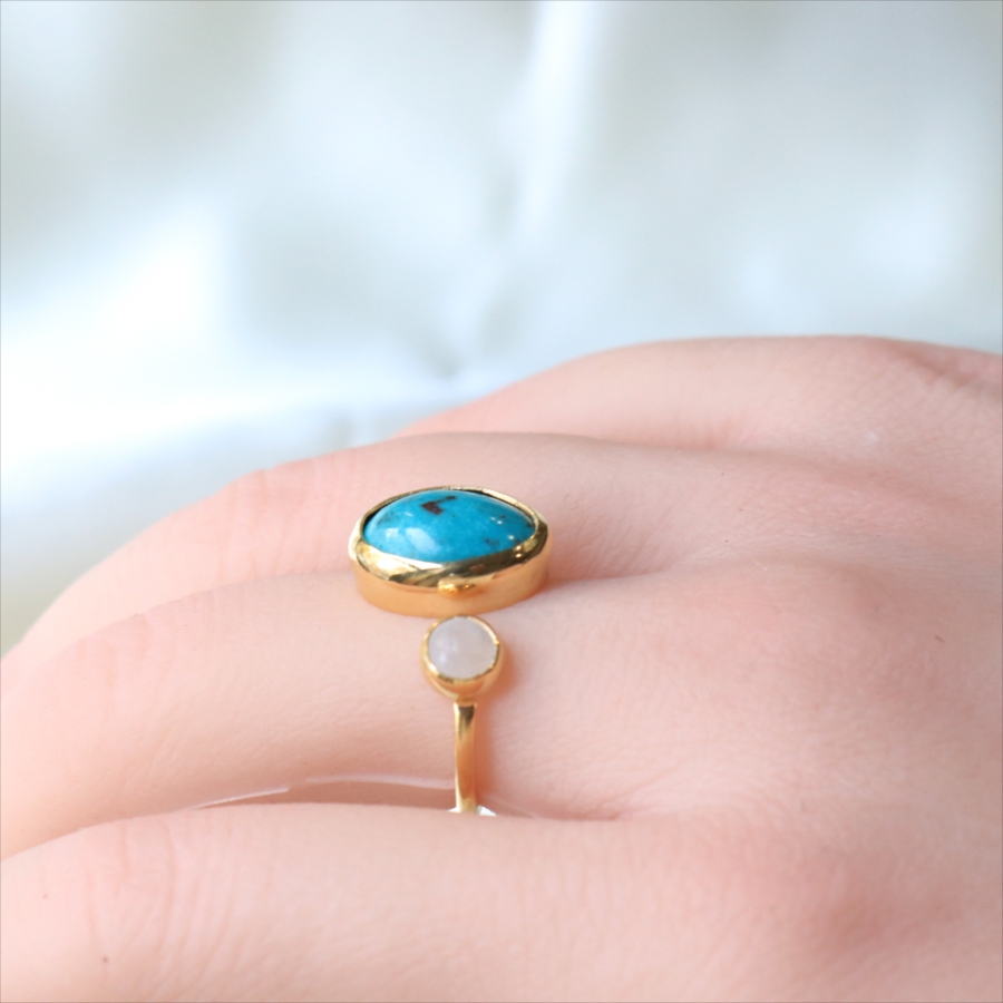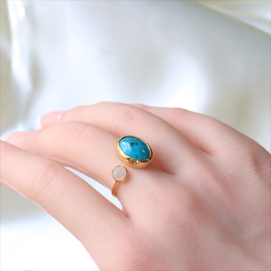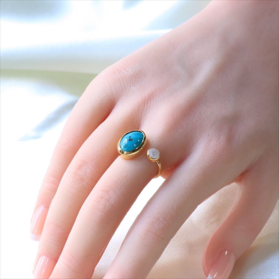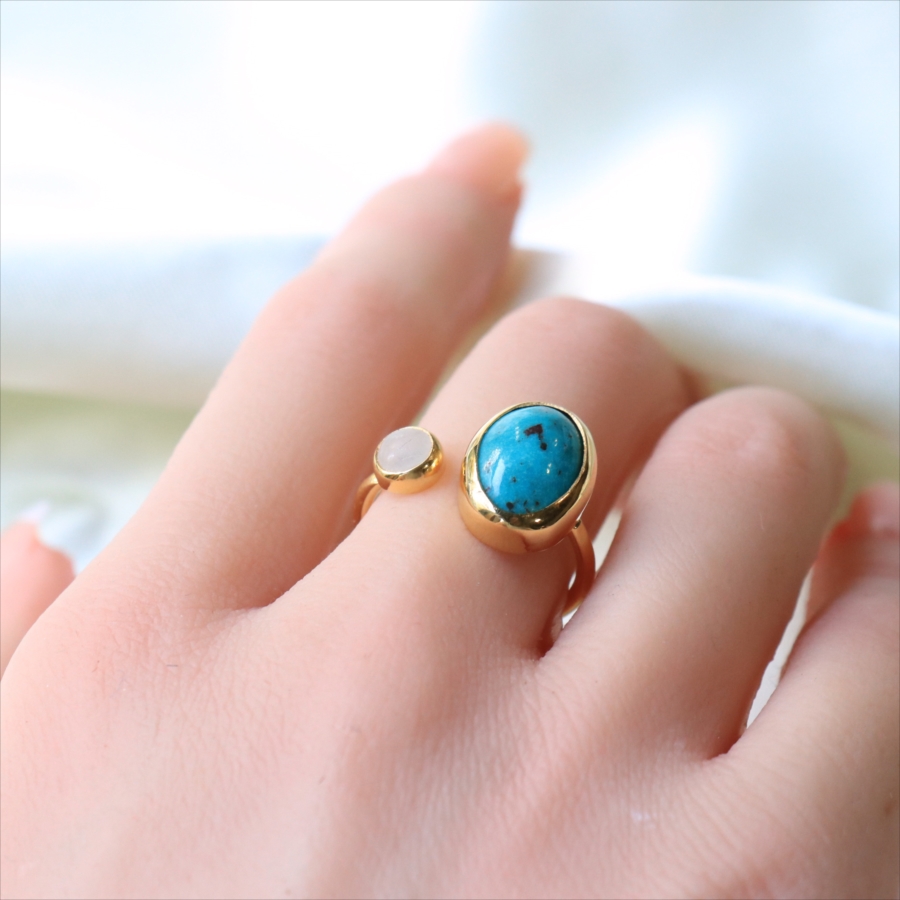 原石の雰囲気をそのままに大粒のマットなブルーカラーのターコイズに寄り添うコロンとしたムーンストーン。ゴールドカラーとの相性が良く上品な印象です。