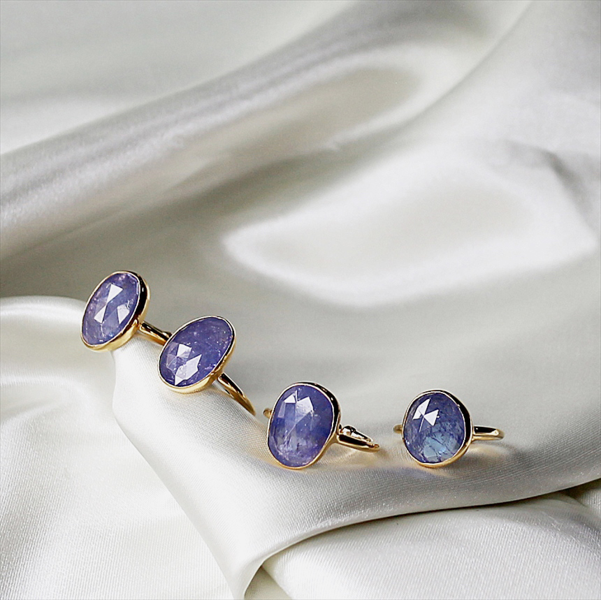 青紫や群青色、見る角度によって、グリーンやピンクなど様々な色彩の混じりあうブルーカラーが大変美しい石、タンザナイト。華やかで存在感あるリングです。