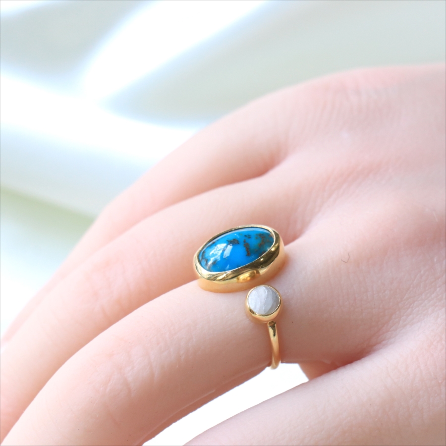 原石の雰囲気をそのままに大粒のマットなブルーカラーのターコイズに寄り添うコロンとしたムーンストーン。ゴールドカラーとの相性が良く上品な印象です。