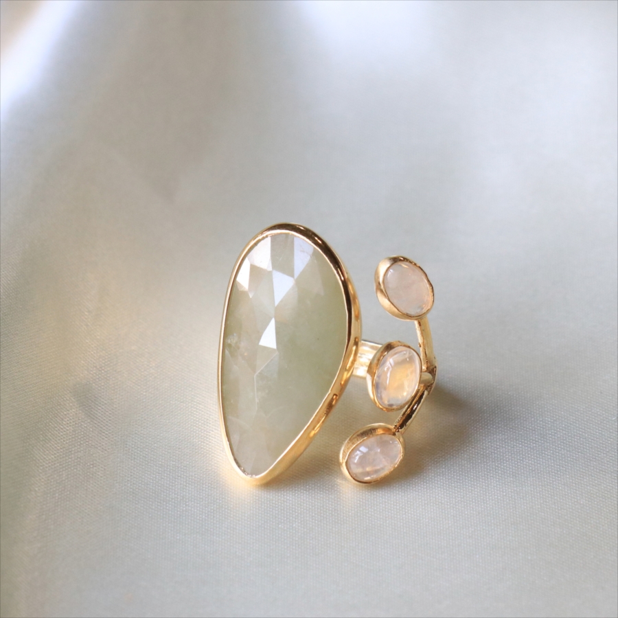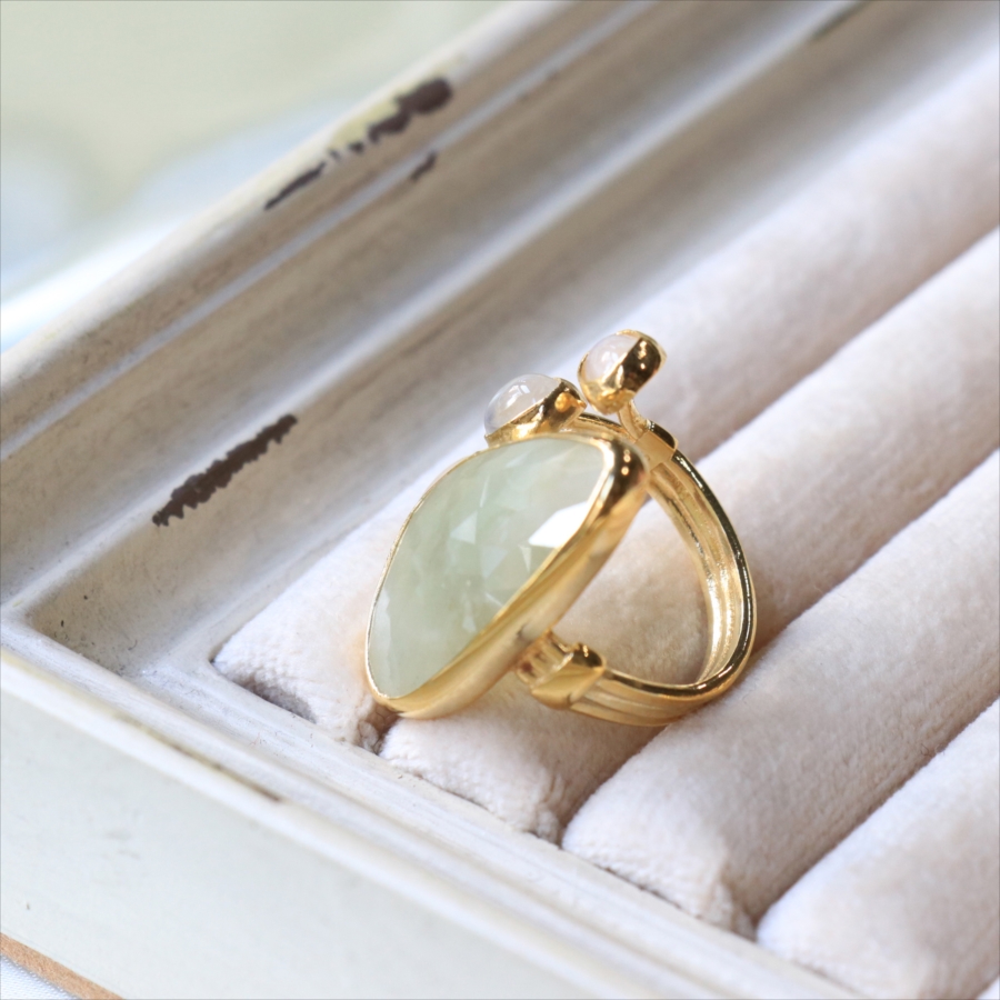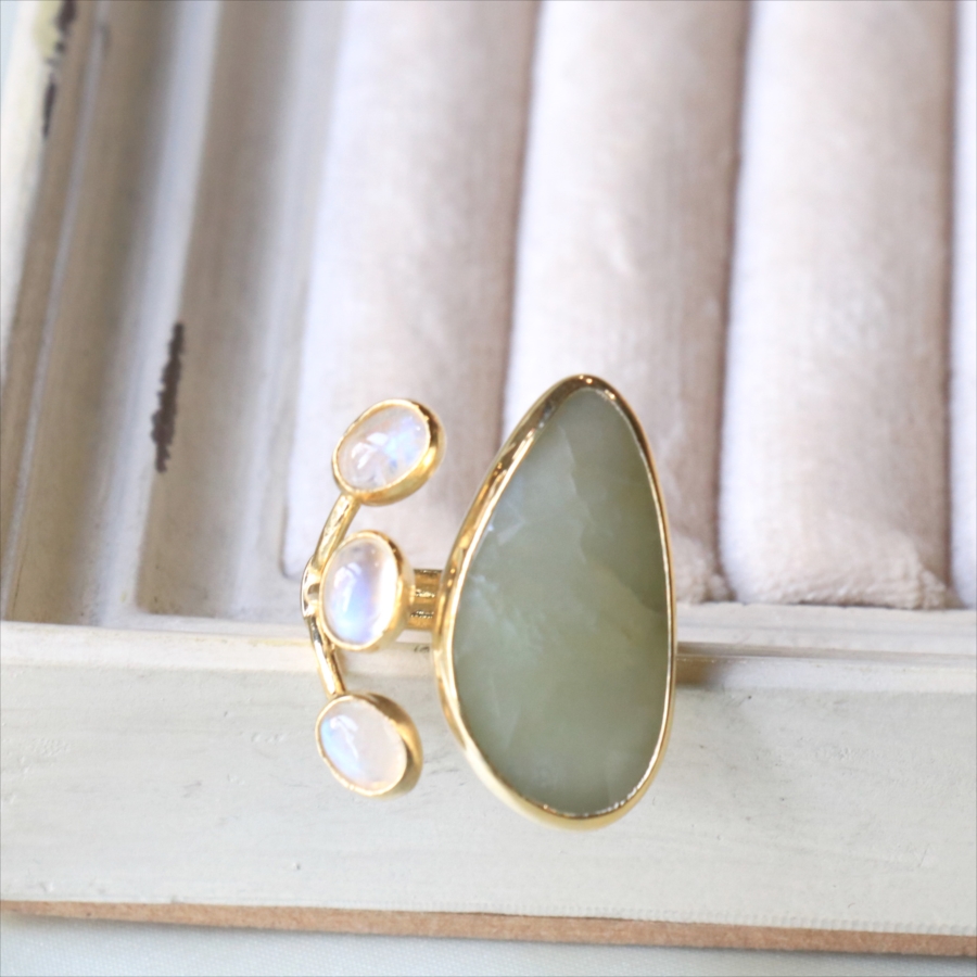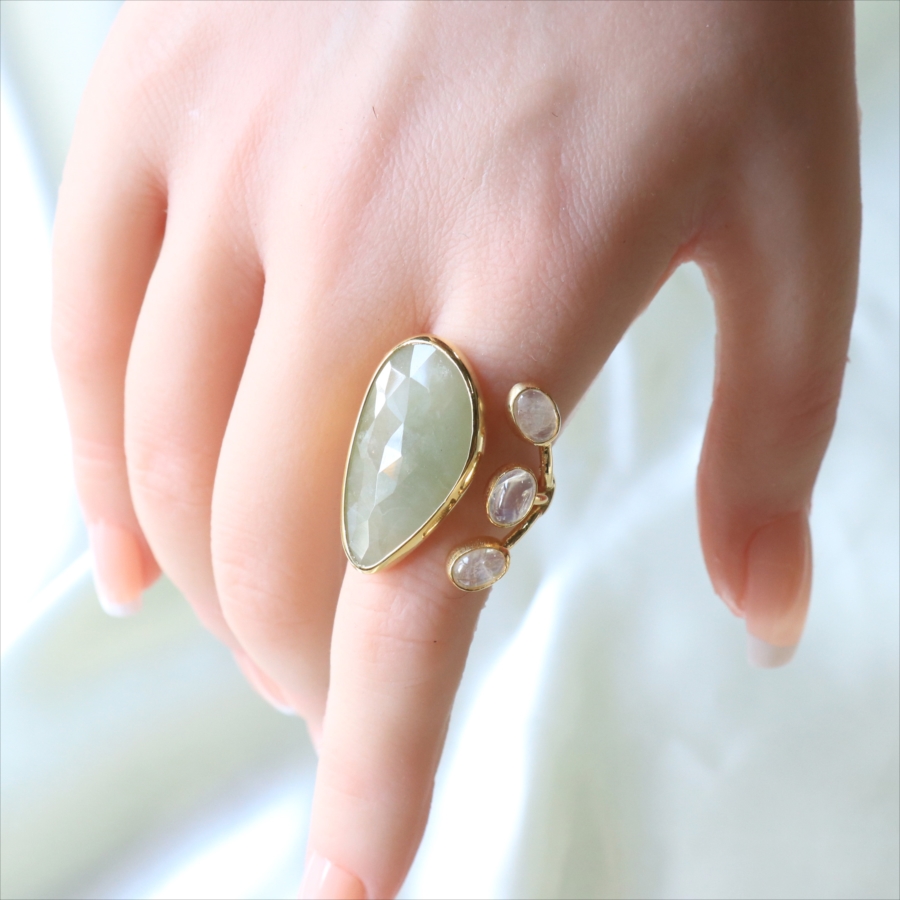 とろみのあるミルキーグリーン美しい大粒のサファイア。かわいらしいサイズのカボションカットのムーンストーンが三つ寄り添うようについたデザインのリングです。絶妙なニュアンスカラーが上品さを引き出します。それぞれの石は裏面が抜けているので、光を透す仕様になっています。※サファイア2.7×1.5cm