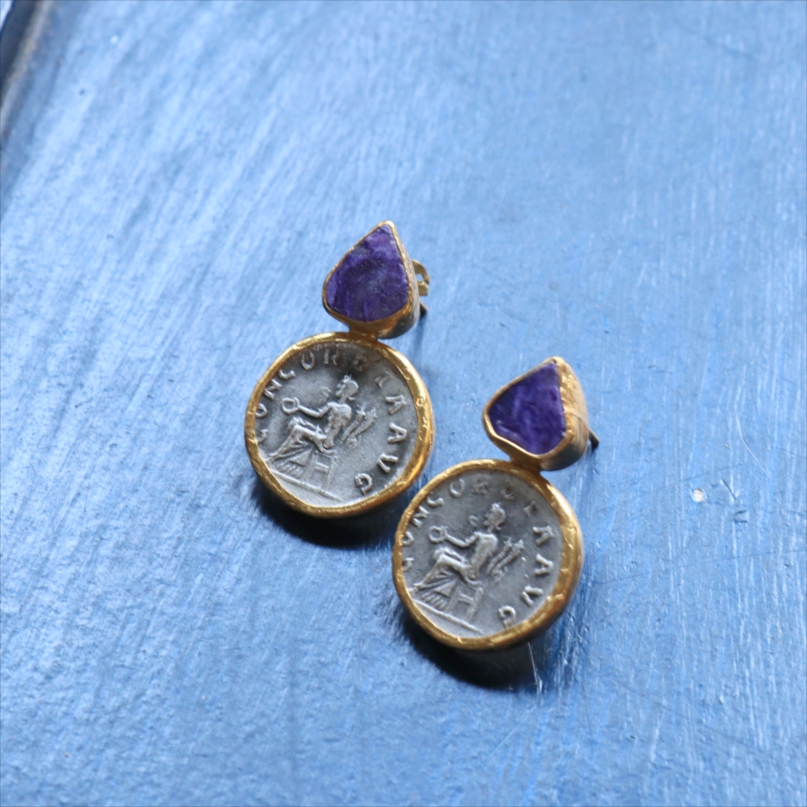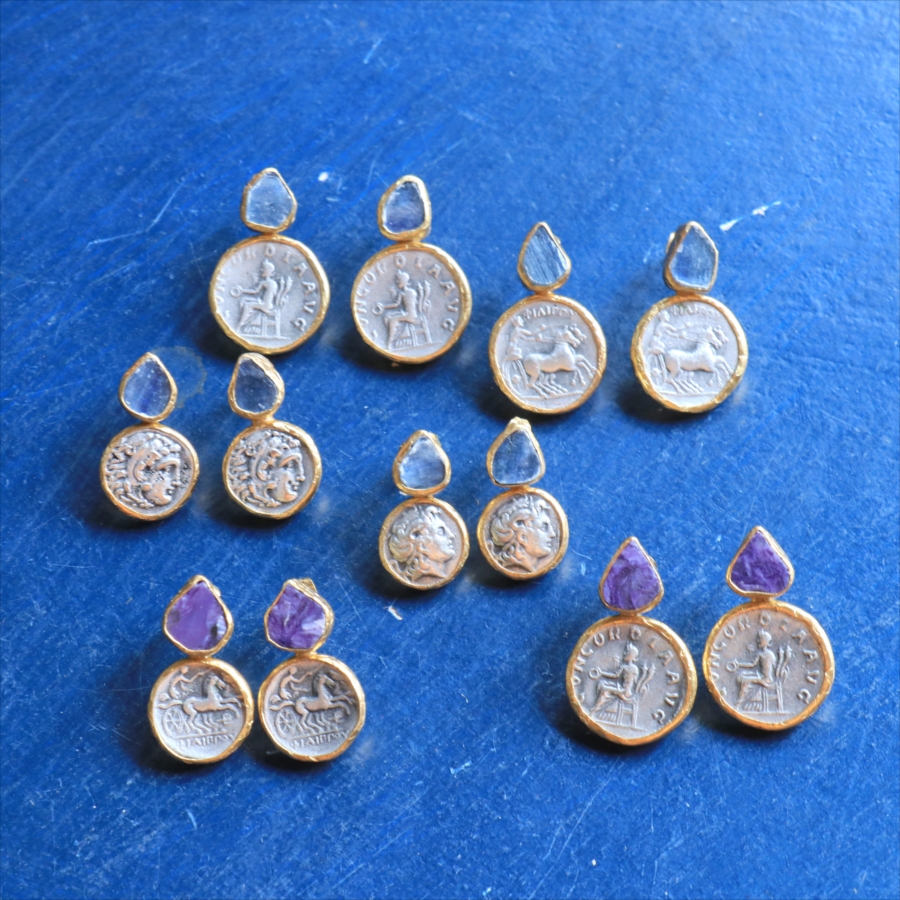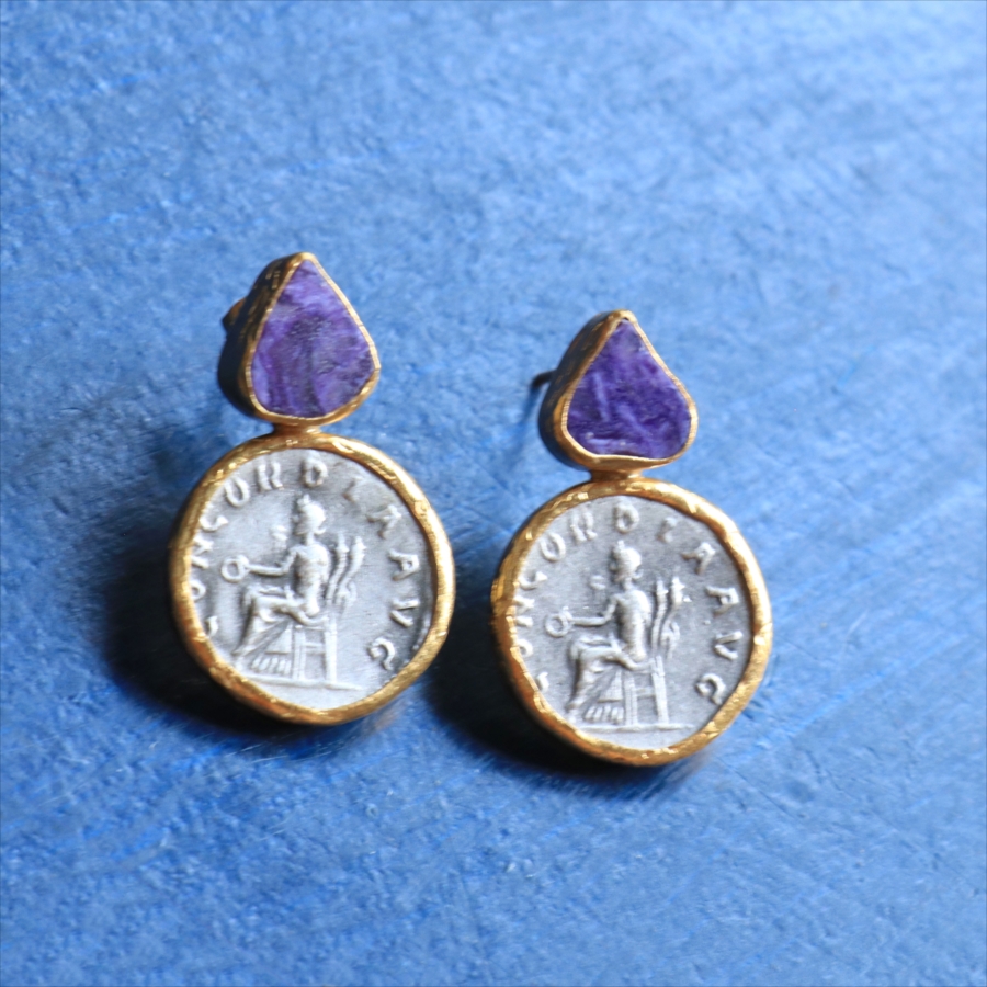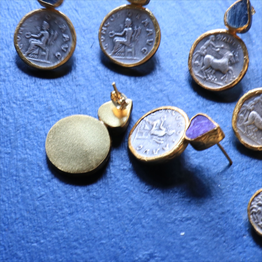ドロップ形のラピスラズリと、とシルバーコインが並んだ立体感のあるスタッドピアスです。ハンドメイドらしい無骨なデザインが魅力。(コインは、アンティークコインのレプリカ ROMAN EMPIRE GERMANICUS 15BC)※コイン直径1.8cm