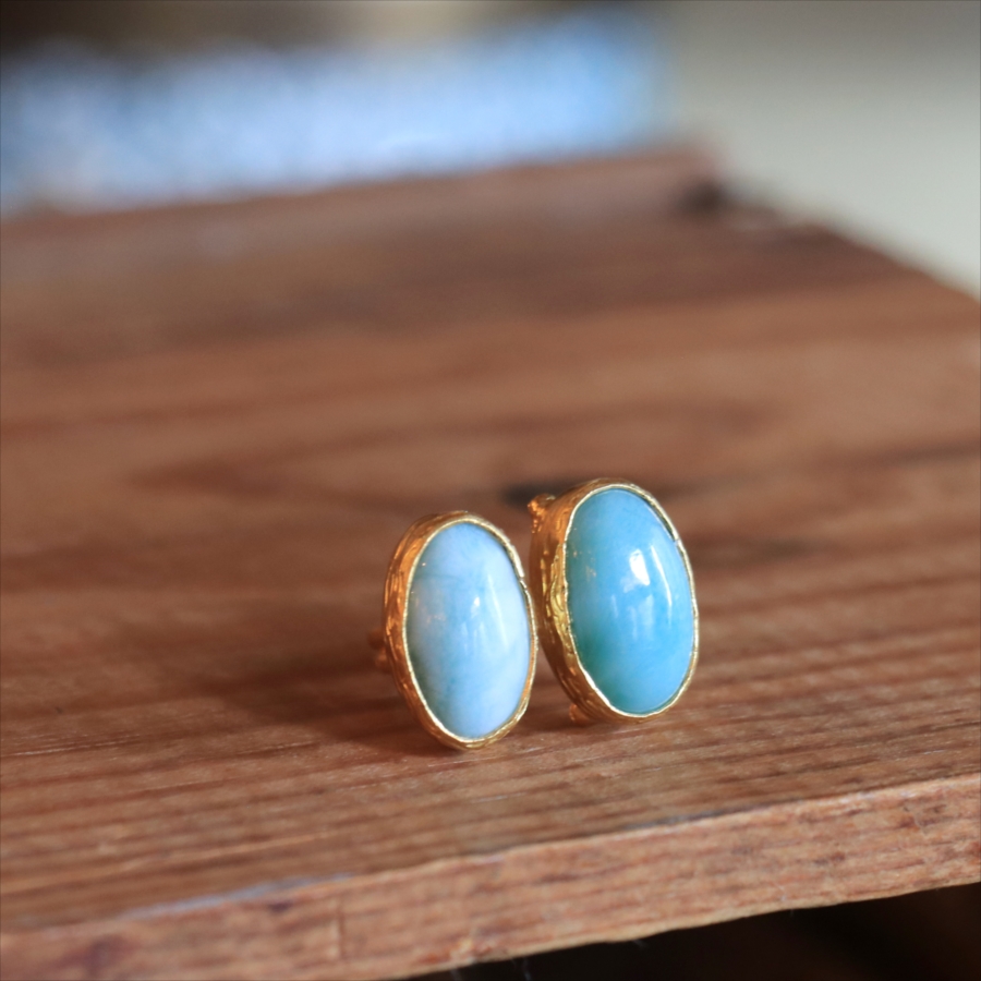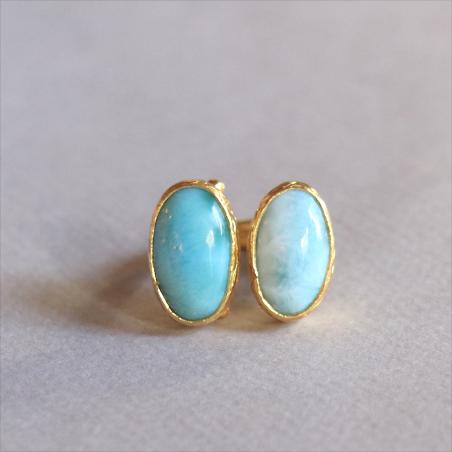 海に映る雲のような模様が広がる、優しいブルーが美しいラリマーダブルリングです。双子のように並ぶオーバルのラリマー。シンプルながらも個性的が光る一点ものジュエリーです。