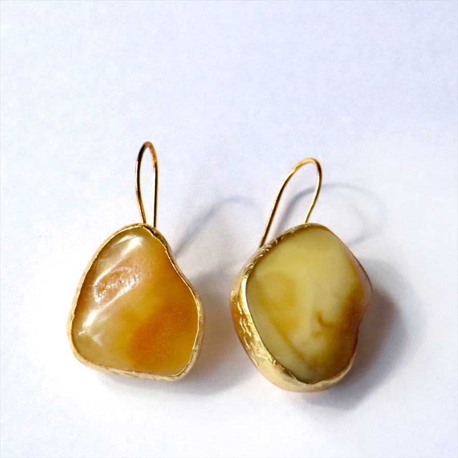 とろみのある黄みがかったバタースコッチのようなミルクカラーにライトブラウンの内包物が描くマーブル模様が美しい、アンバーラフカットピアス。左右の形や模様が異なるのも、自然のままの琥珀の個性を活かしたデザインならでは。