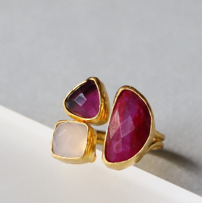 アルサメイア 三つの石のリング ルビー×アメシスト×ホワイトカルセドニー 天然石22KGP トルコジュエリー