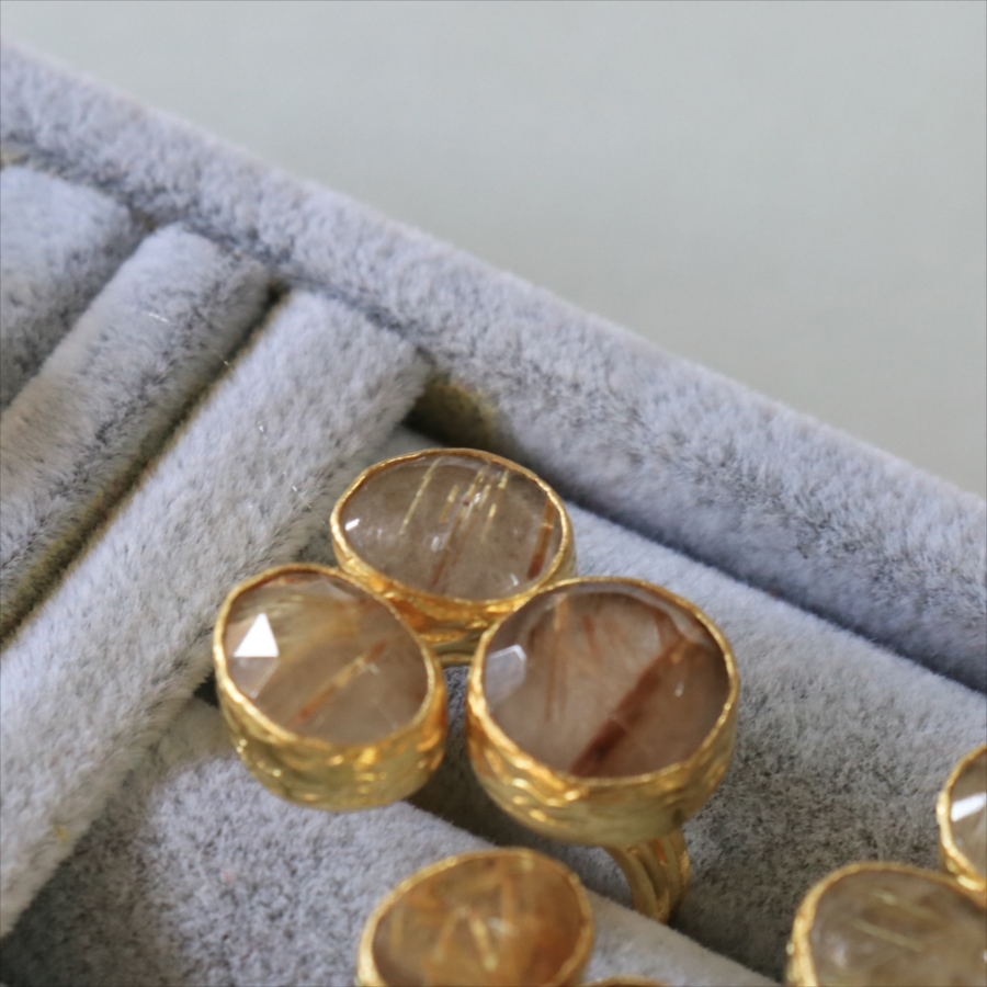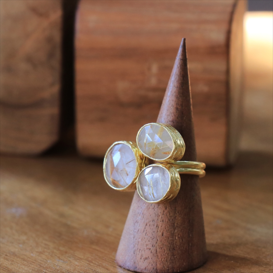 天然のクォーツに針のようなインクルージョンがはいったルチルクォーツのリングです。同じシリーズの3つの石リングの中では、やや小振りで、普段使いでも活躍しそう。肌なじみの良いカラーは違和感なく、合わせやすくおすすめです。