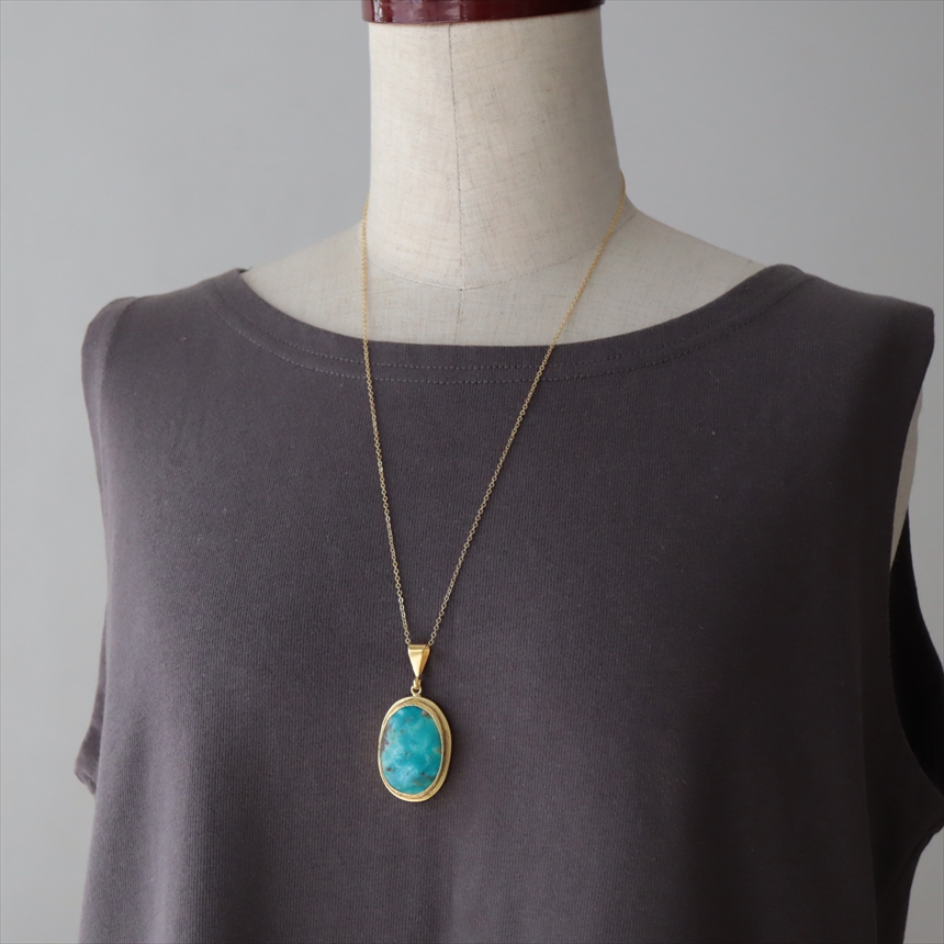 ターコイズ ペンダント オーバル ビッグストーン 60cmチェーン 天然石22Kゴールドプレーテッド トルコジュエリー
