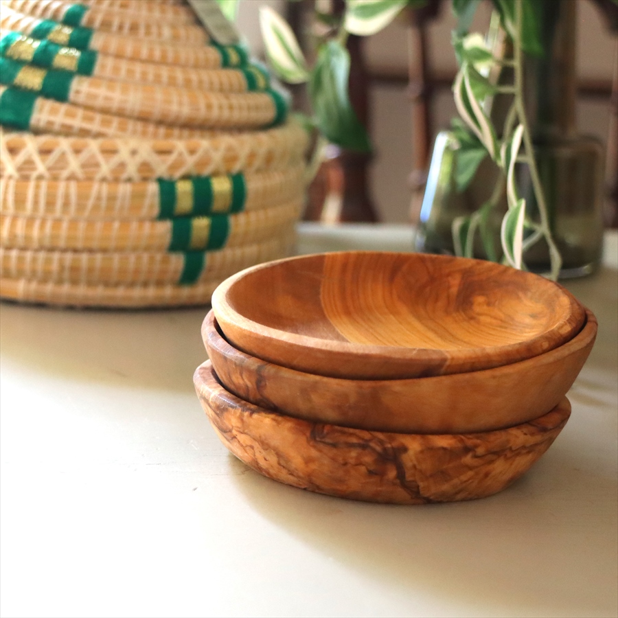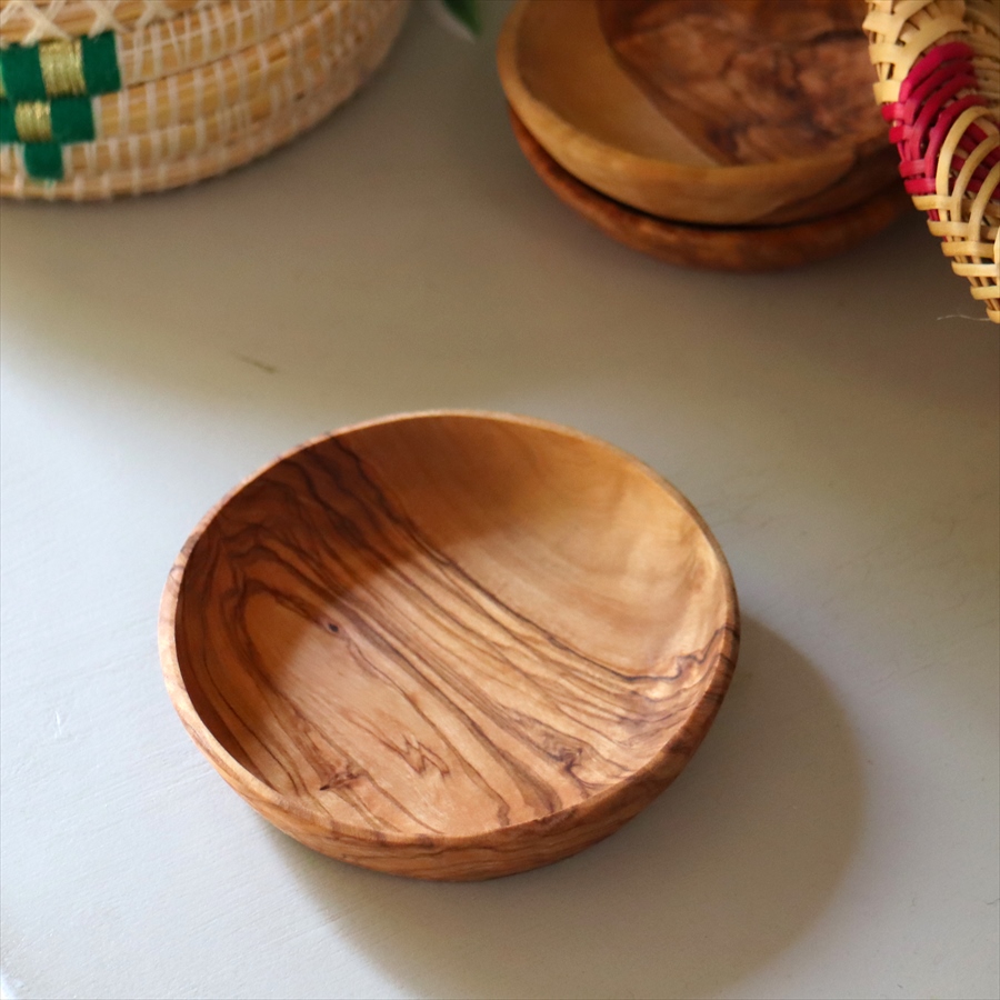 オリーブの木の美しい木目を生かした、木の小皿です。使いやすいサイズの大中小をご用意しました。お菓子入れや豆皿として重宝します。そのままテーブルに出してつかえます。