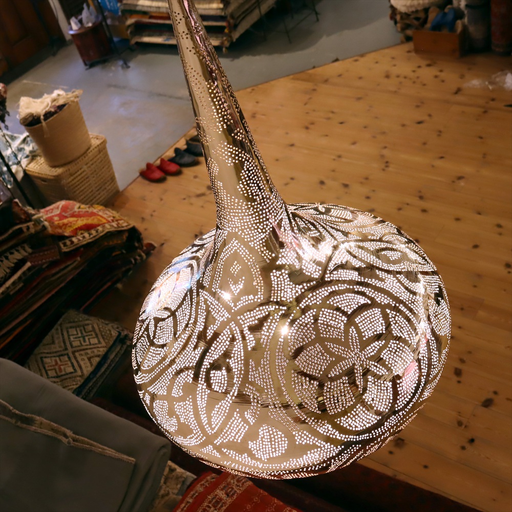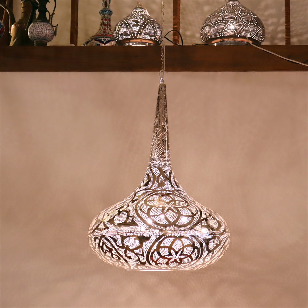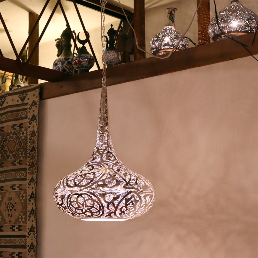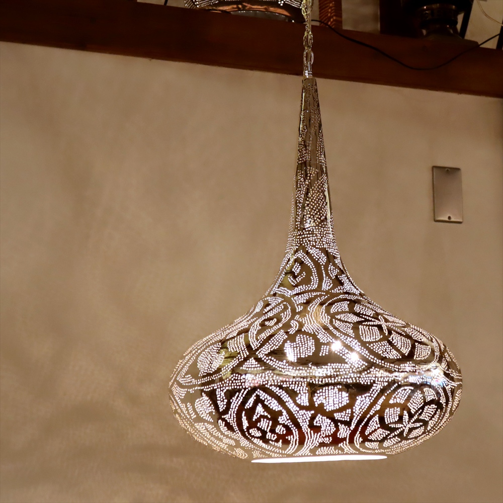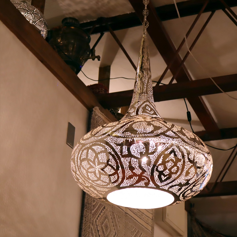 メタルを薄く加工し、コンコンと小さな穴をあけて光をデザインするランプシェードを作りました。エジプト・カイロで中世から作られて来た伝統的な技法で、細工からこぼれる光が壁に映り、エキゾチックな雰囲気を楽しめます。パゴダと名づけられたこのユニークな形は、特に形を成形する技術が必要とされ、技術の高い職人の手によって作られます。吹き抜けなど天井高のあるスペースに吊るすほか、低く吊るして壁に映る陰影を楽しむオブジェとしてもおすすめです。