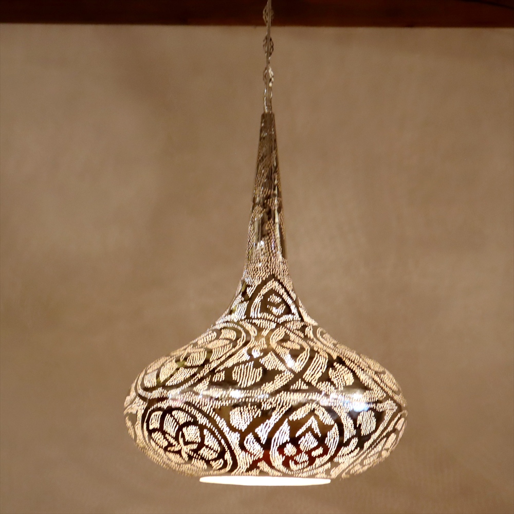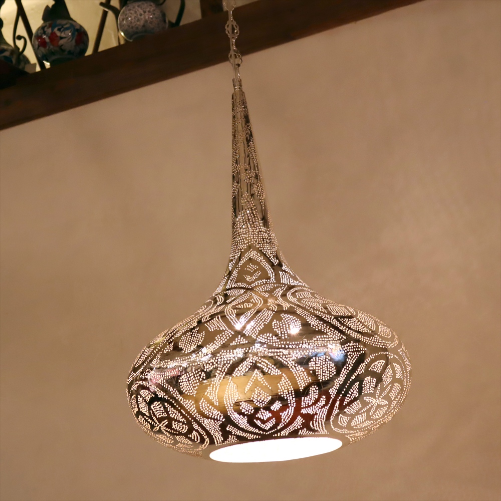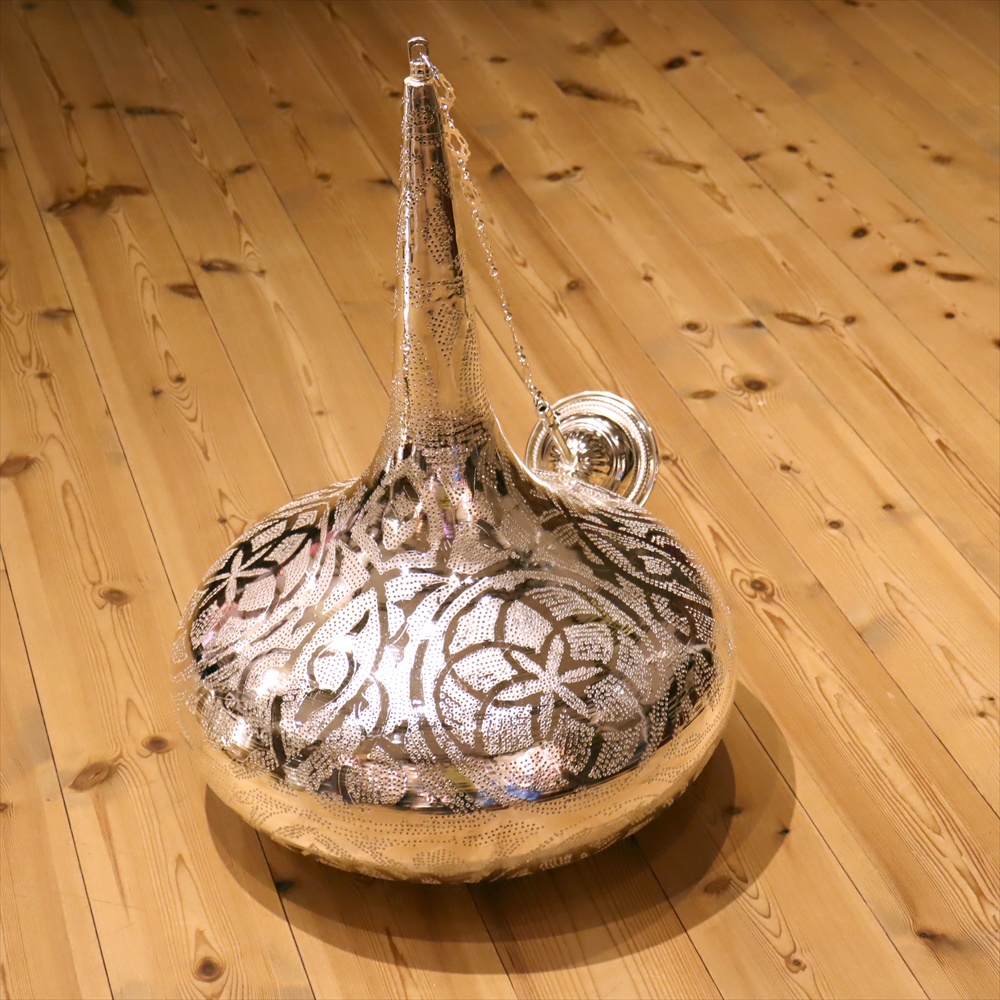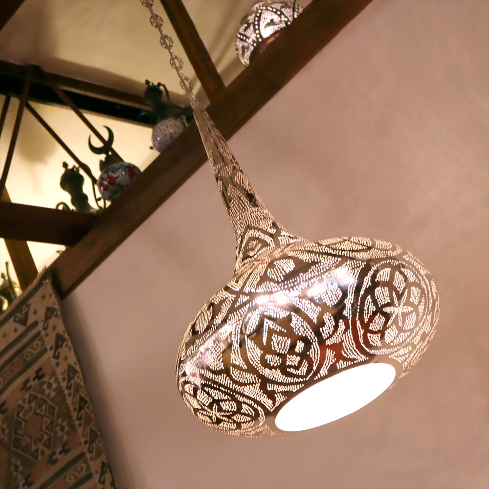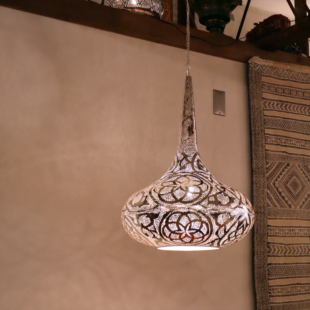 メタルを薄く加工し、コンコンと小さな穴をあけて光をデザインするランプシェードを作りました。エジプト・カイロで中世から作られて来た伝統的な技法で、細工からこぼれる光が壁に映り、エキゾチックな雰囲気を楽しめます。パゴダと名づけられたこのユニークな形は、特に形を成形する技術が必要とされ、技術の高い職人の手によって作られます。吹き抜けなど天井高のあるスペースに吊るすほか、低く吊るして壁に映る陰影を楽しむオブジェとしてもおすすめです。