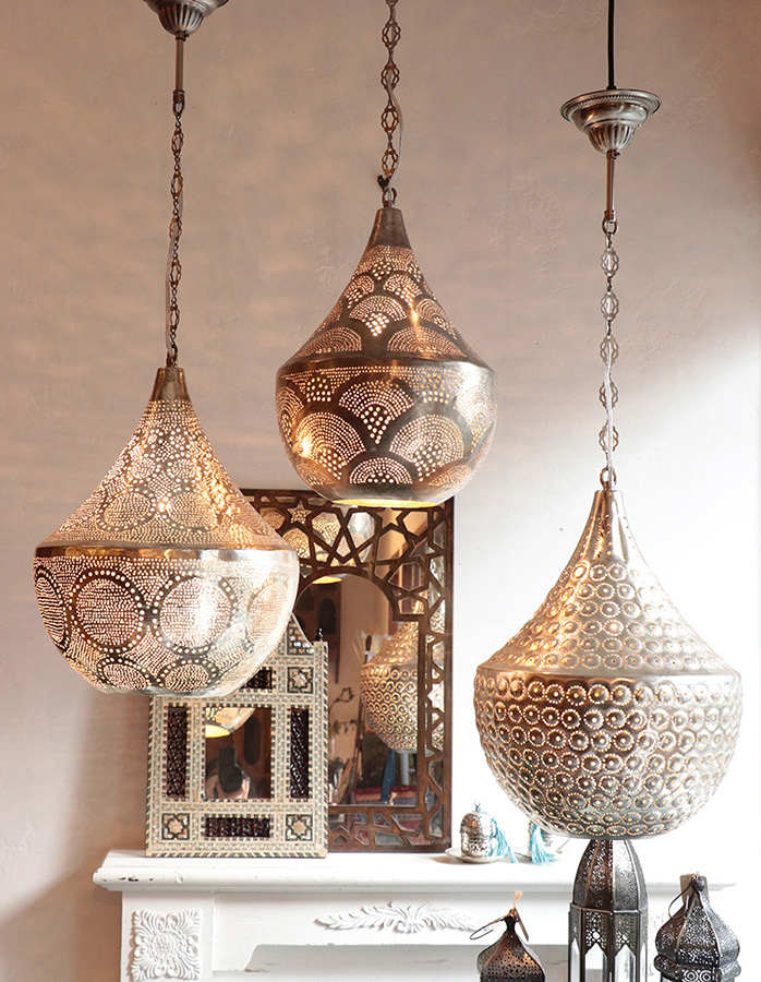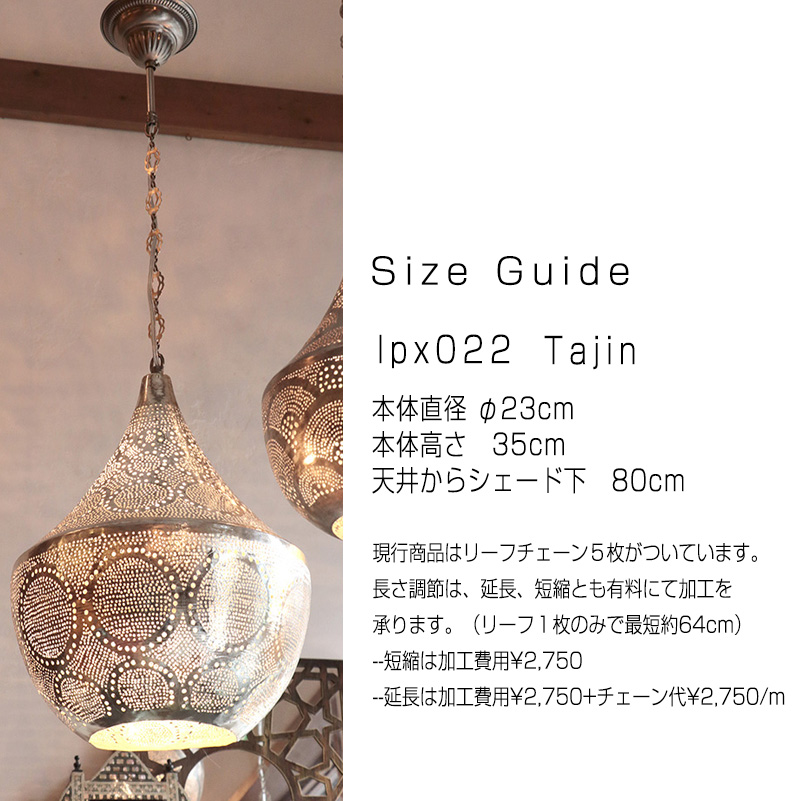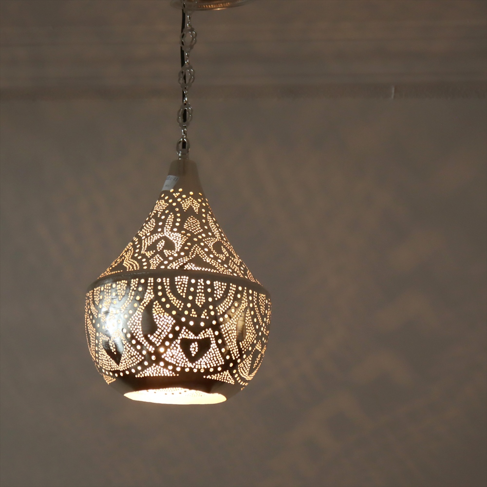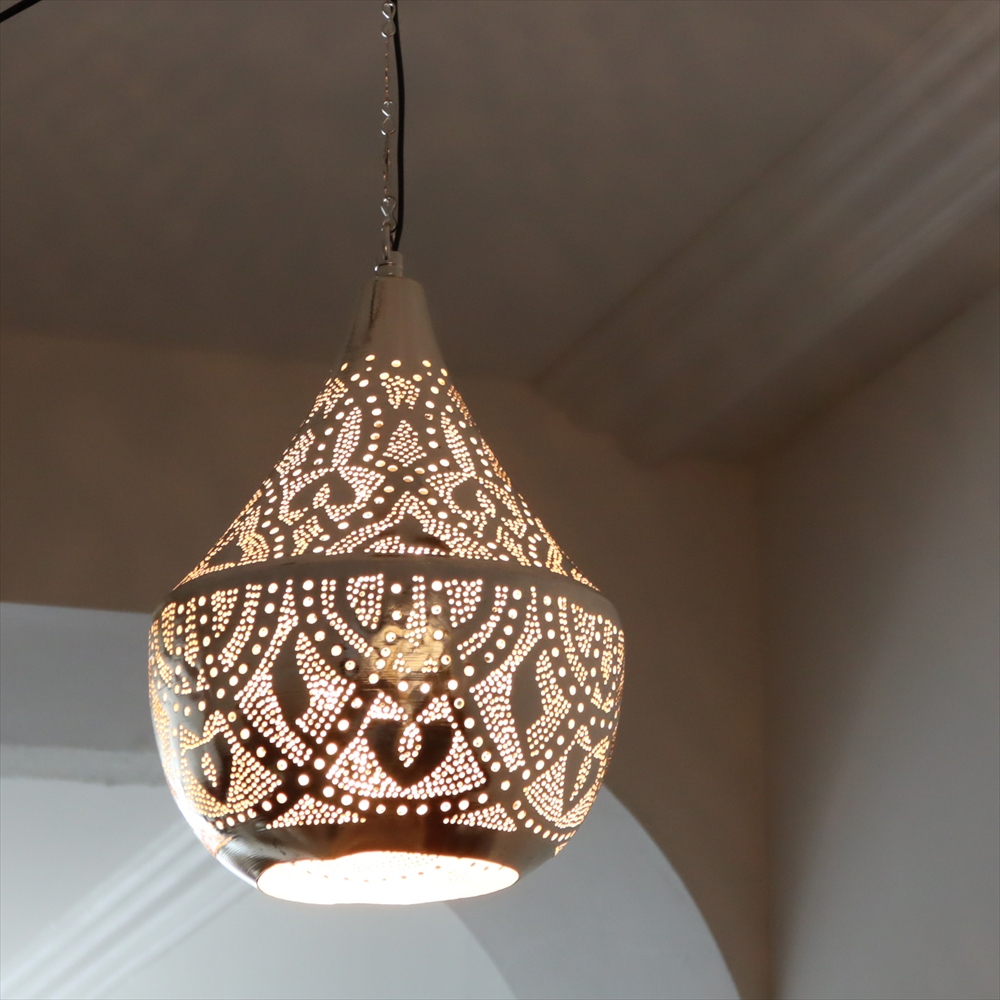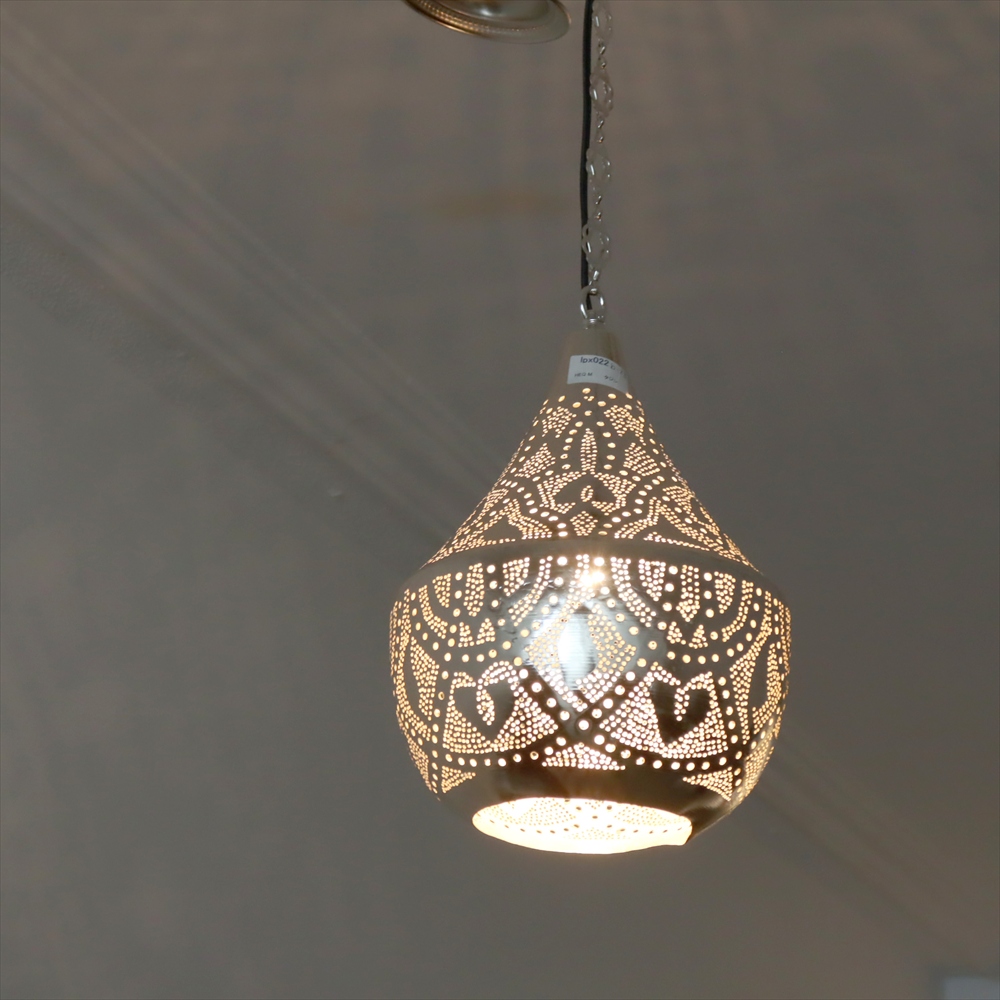 メタルを薄く加工し、コンコンと小さな穴をあけて光をデザインするランプシェードを作りました。中世から作られて来た伝統的な技法で、細工からこぼれる光が壁に映り、エキゾチックな雰囲気を楽しめます。配線・ソケット等、日本でご使用可能な状態に加工済みです。ボディカラーは光沢のあるシルバー色です。点灯させていないときもインテリアとして個性的な空間を演出してくれます。