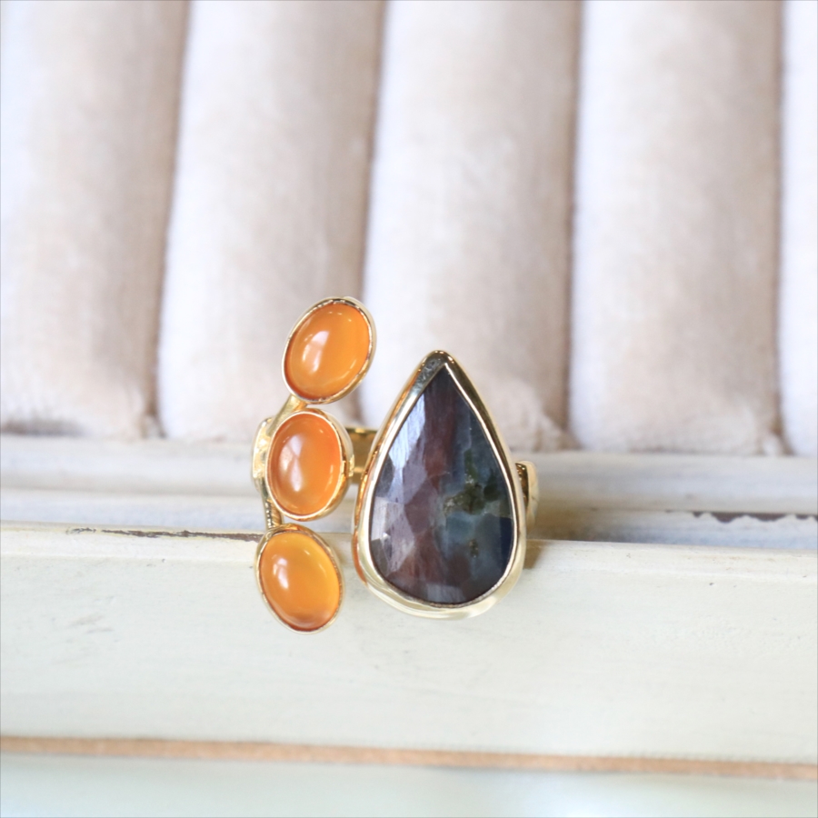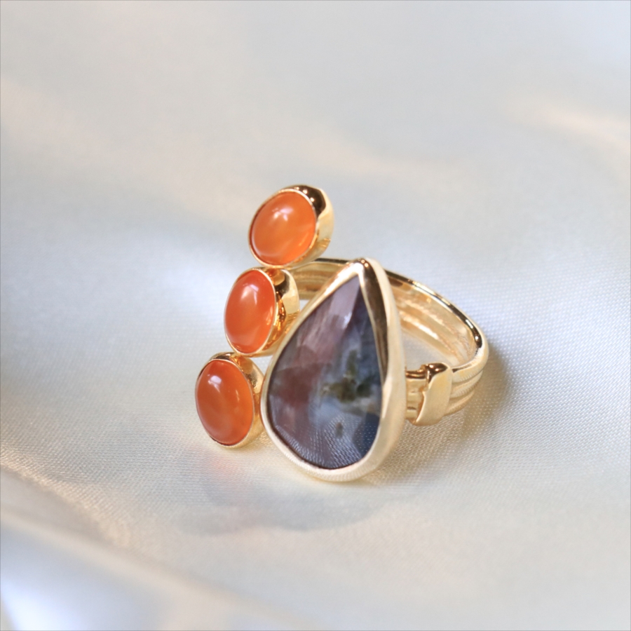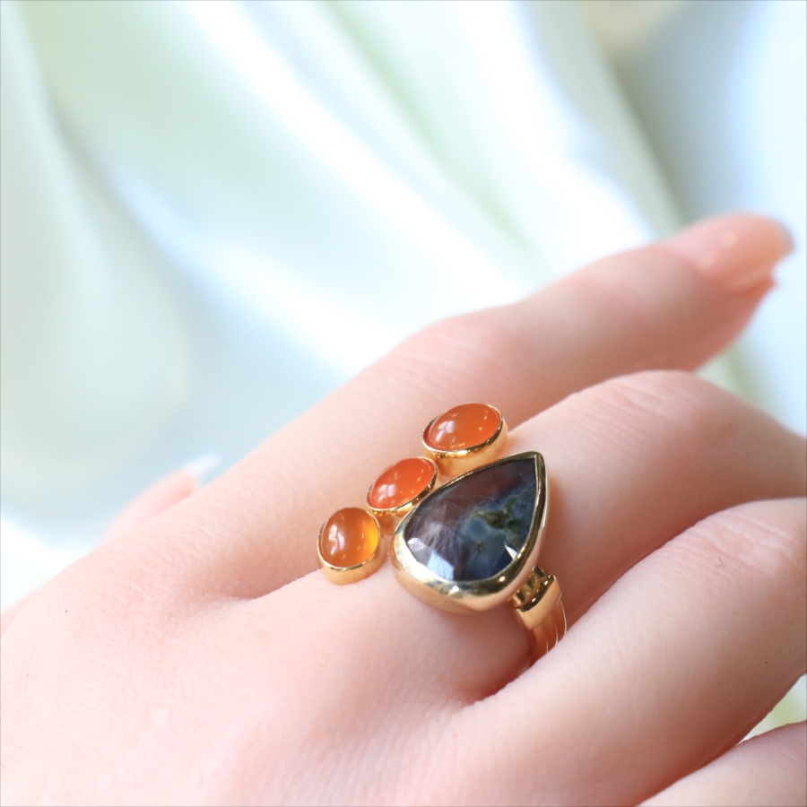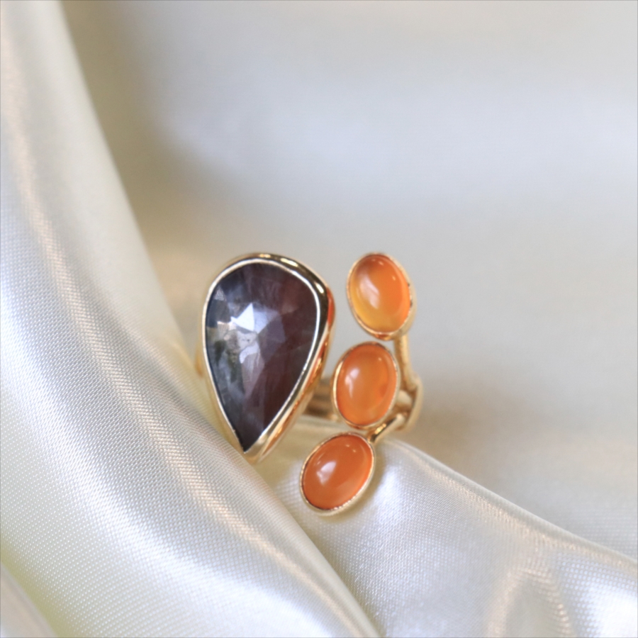ボルドー、ブルー、深いグレーにやわらかな白い結晶がにじんだような色味が美しいサファイア。かわいらしいサイズのカボションカットのカーネリアンが三つ寄り添うようについたデザインのリングです。絶妙なニュアンスカラーが上品さを引き出します。それぞれの石は裏面が抜けているので、光を透す仕様になっています。。※サファイア1.8×1.1cm