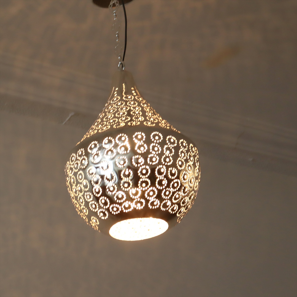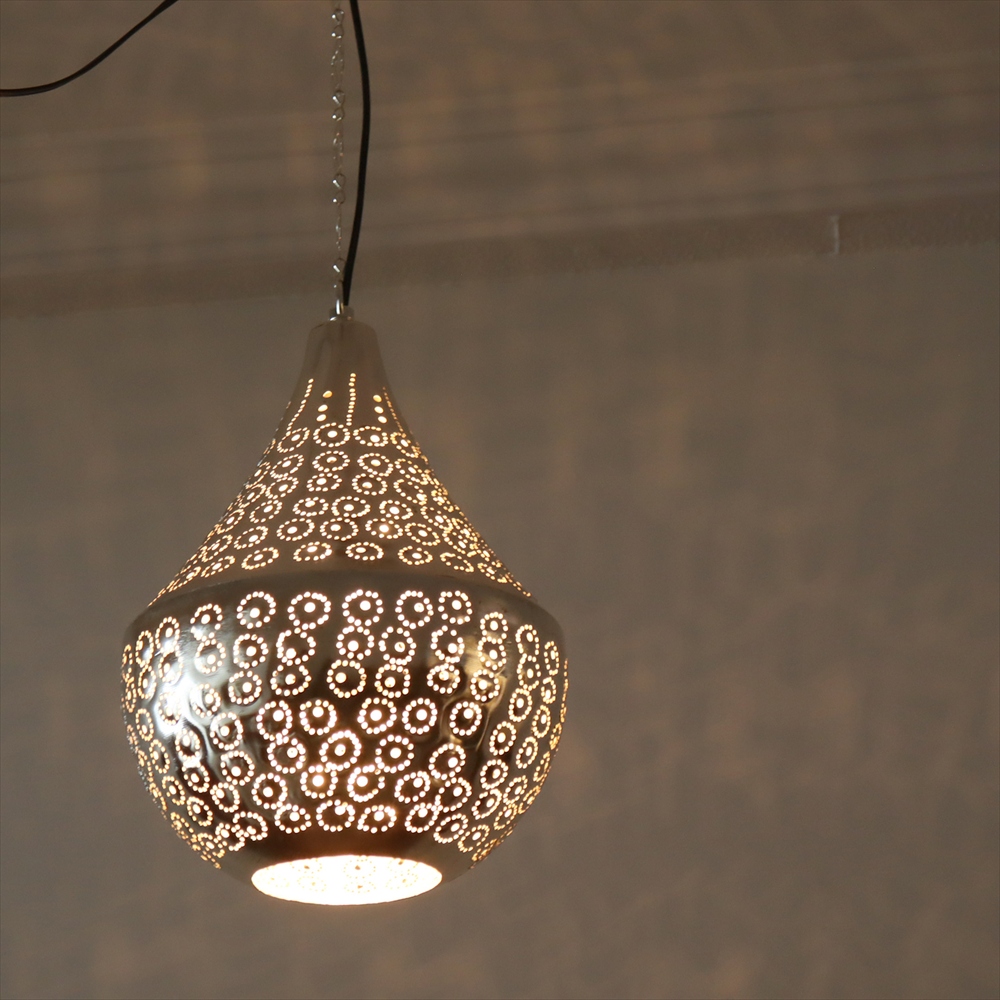 メタルを薄く加工し、コンコンと小さな穴をあけて光をデザインするランプシェードを作りました。中世から作られて来た伝統的な技法で、細工からこぼれる光が壁に映り、エキゾチックな雰囲気を楽しめます。配線・ソケット等、日本でご使用可能な状態に加工済みです。ボディカラーは光沢のあるシルバー色です。点灯させていないときもインテリアとして個性的な空間を演出してくれます。