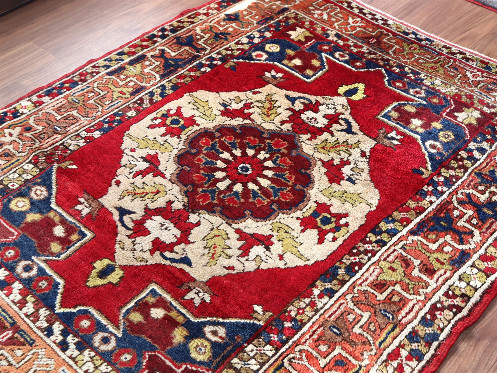 トルコ絨毯らしいやわらかい織り地です。部分的にパイルのすり減っている箇所もありますが、織られた年代を考慮するとコンディションは良好でしょう。