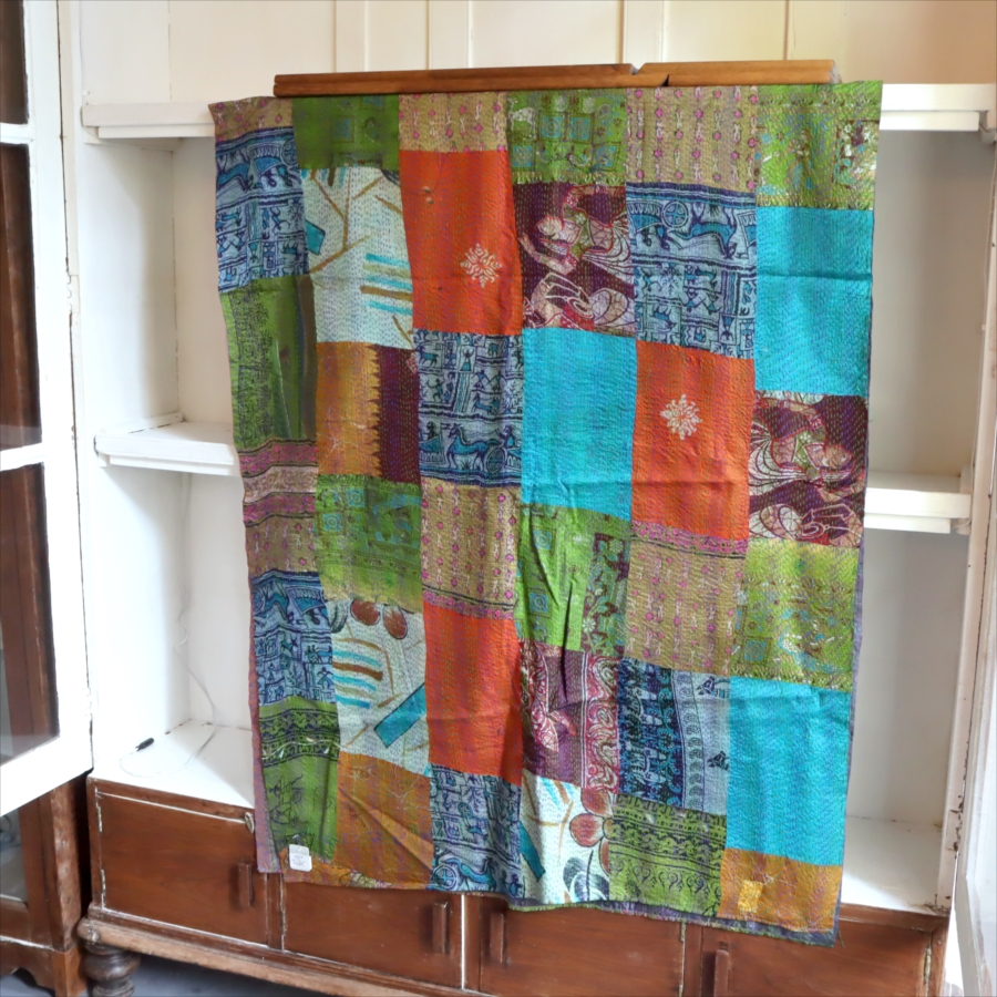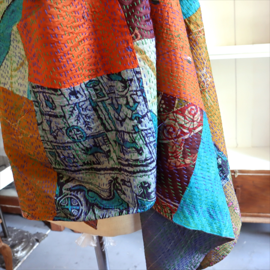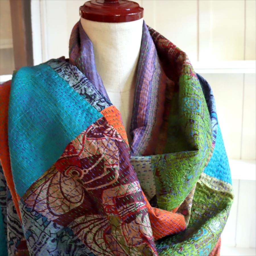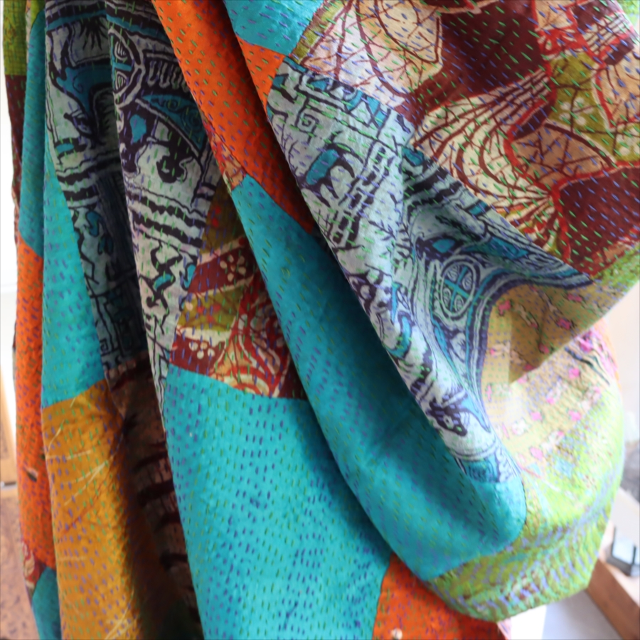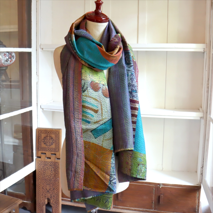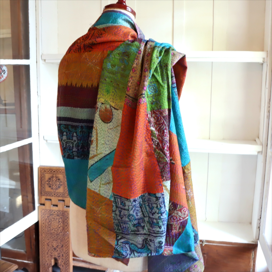 カンタ刺繍 シルクストール 大判224×89cm モザイク パッチワーク 【一点もの 現品】 Kantha embroidery, India