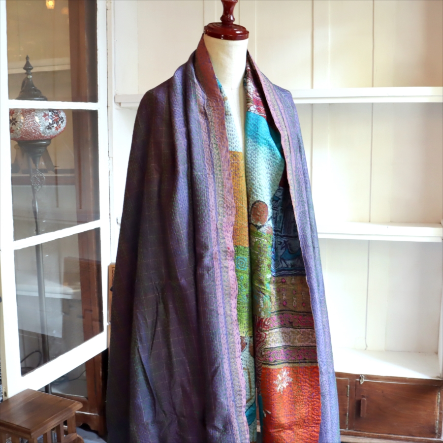 使われているサリーは20世紀後期のベンガル地方のものとされ、刺繍布も同じくベンガル地方で現在つくられています。大判サイズで、ストールとしてはかなりのボリュームがあります。ひざ掛けにしたり、インテリアファブリックとしてソファースローやカーテンのような使い方にもおすすめです。