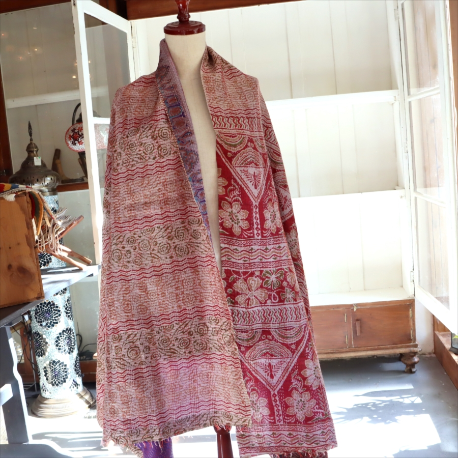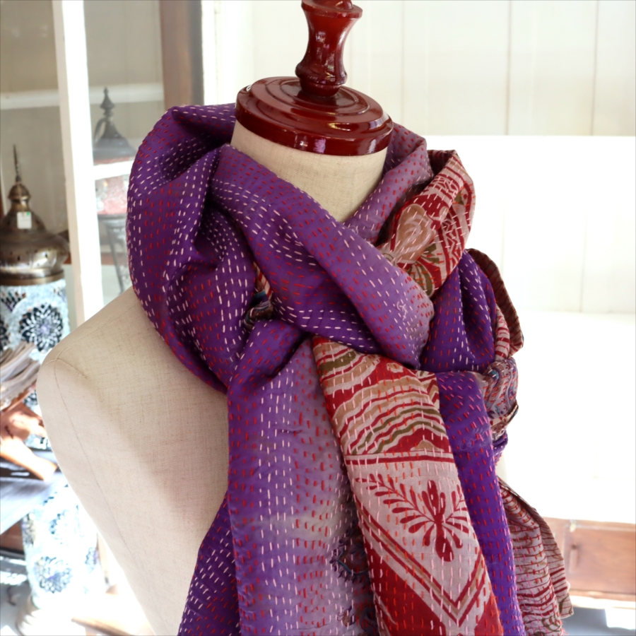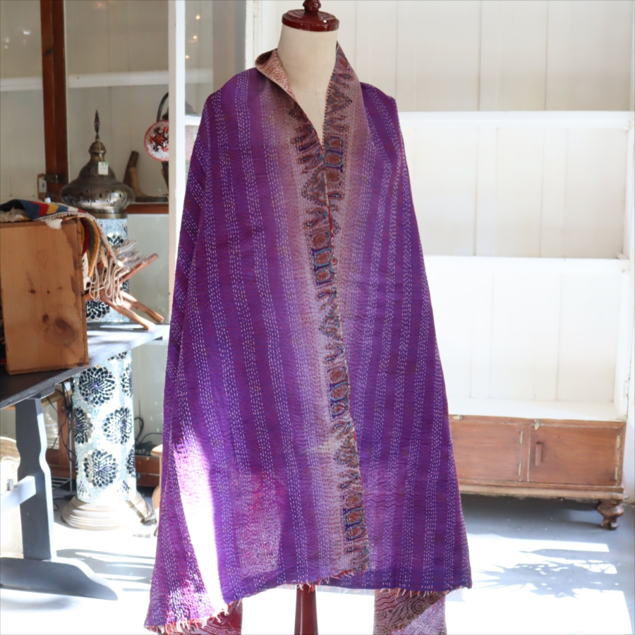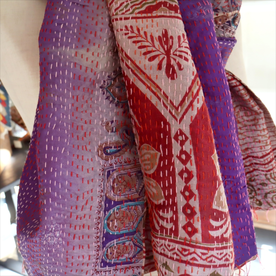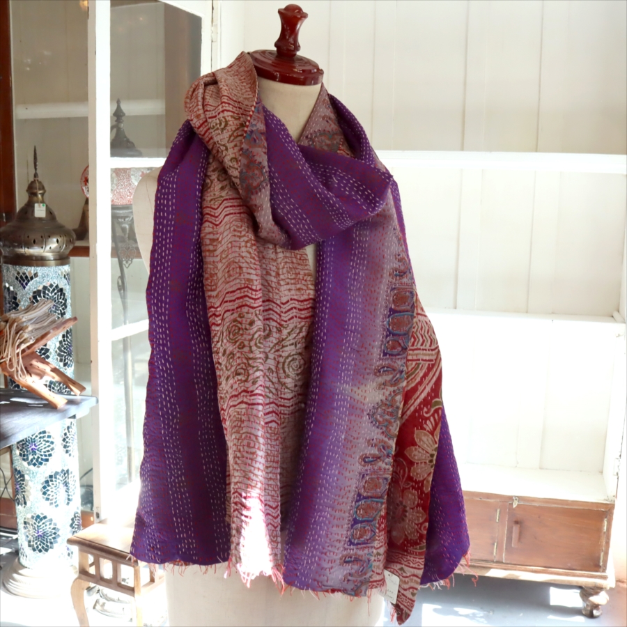 - カンタ刺繍 シルクストール インド リサイクルサリー 202×85cm 【一点もの 現品】 大判ストール