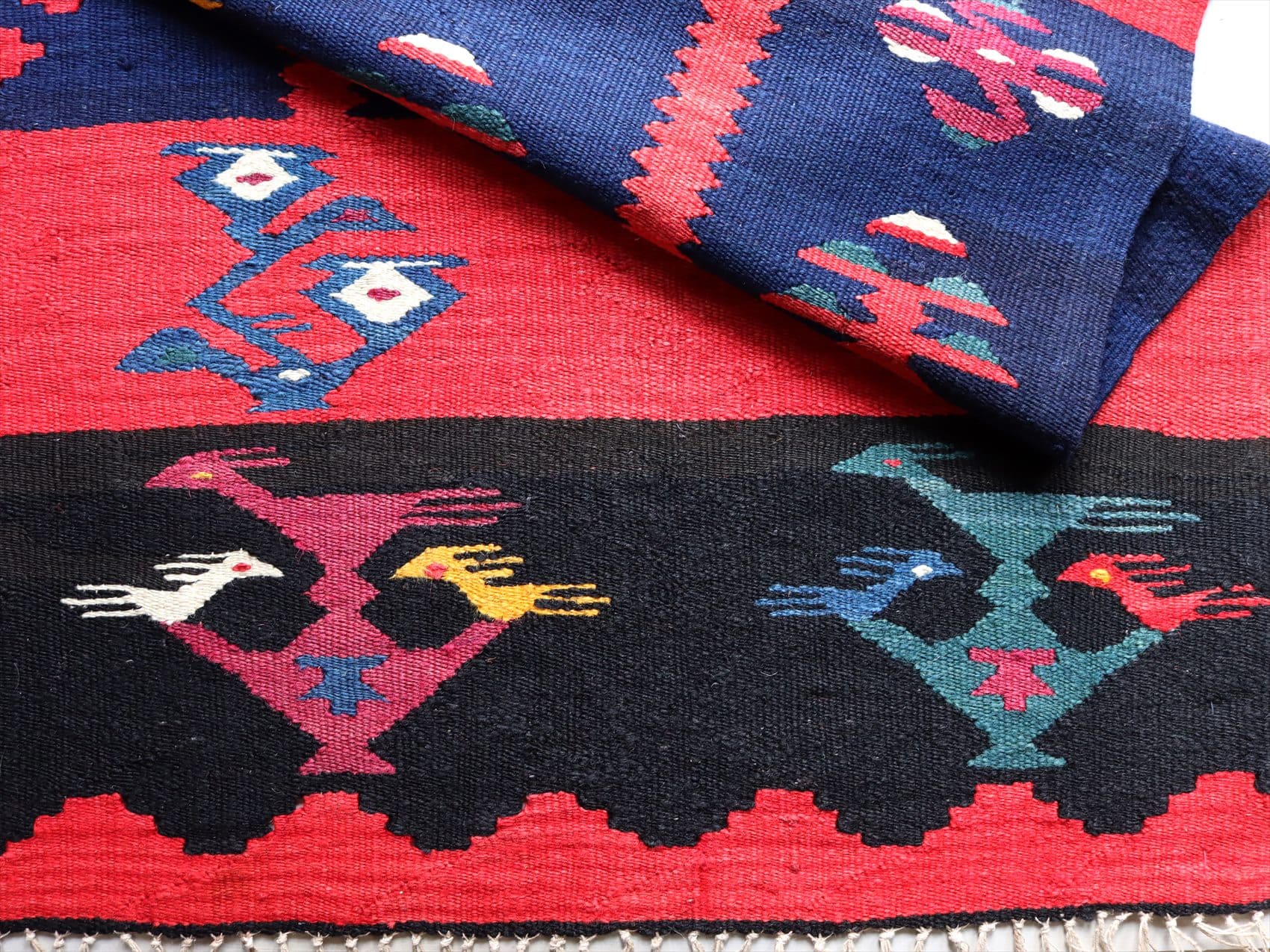 もともと大型のキリムだったものを切り分け、フラグメントにした1枚。細長いピースにユニークな色使いで、上品な樹と鳥が表現されていて、アナトリアのキリムとはまた違った雰囲気が見られます。