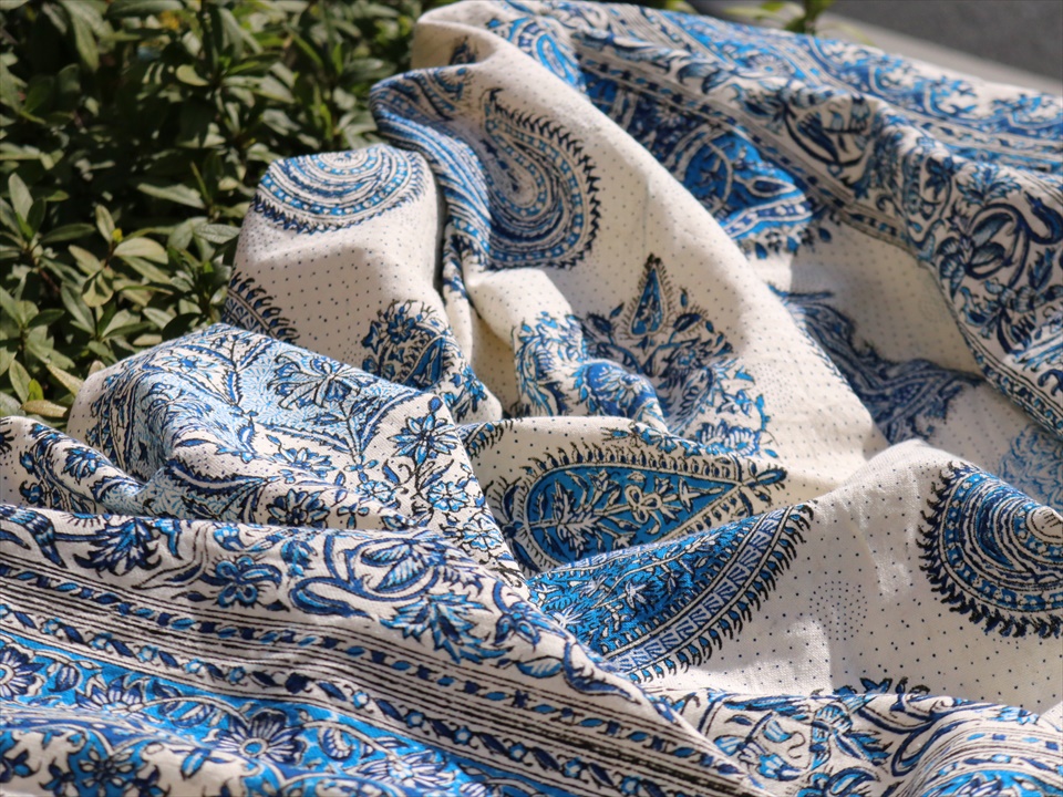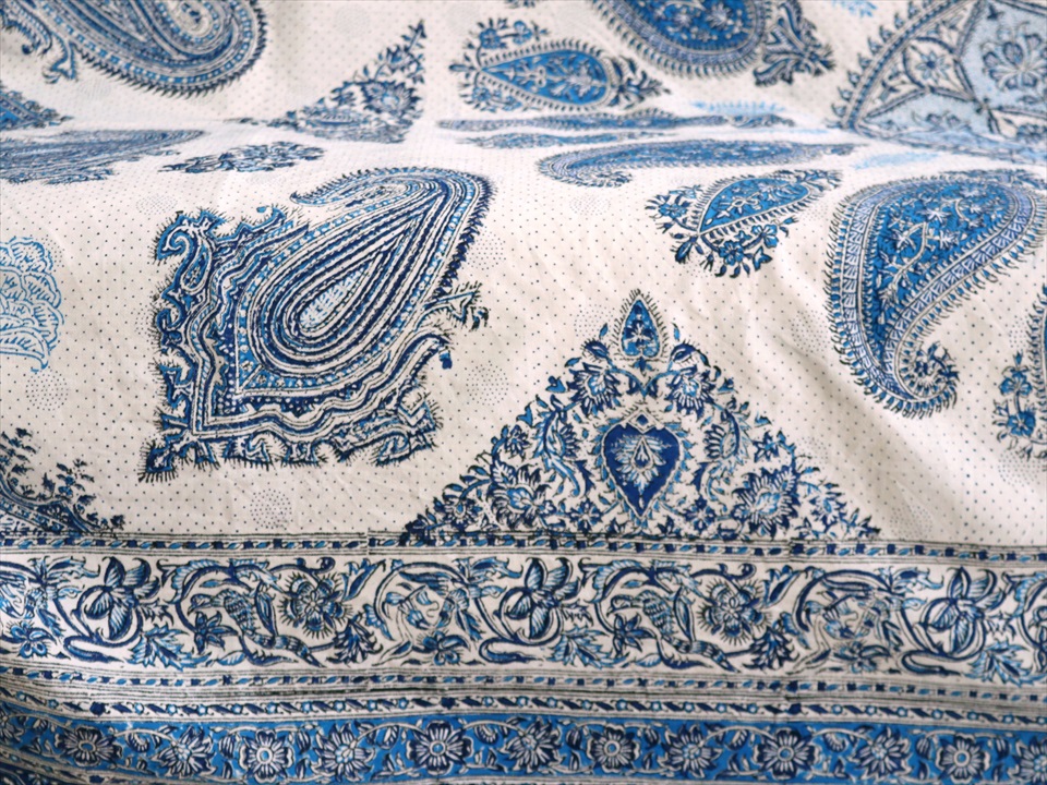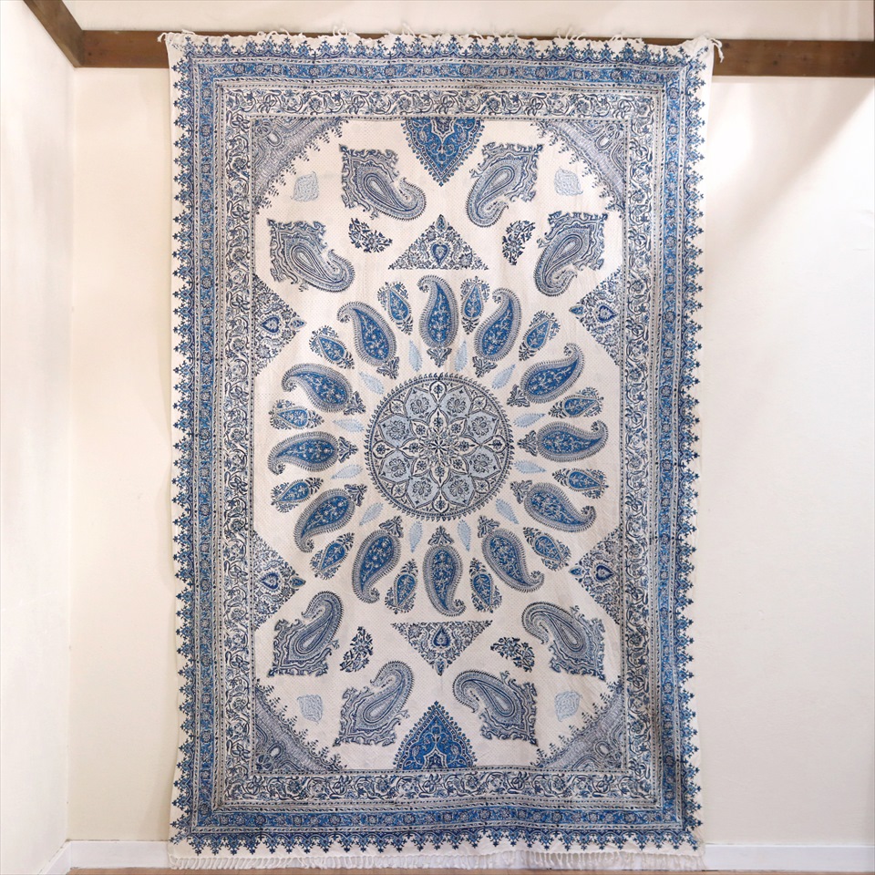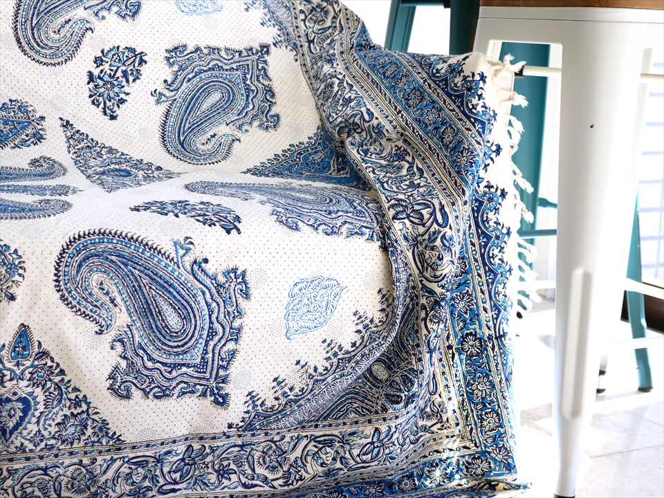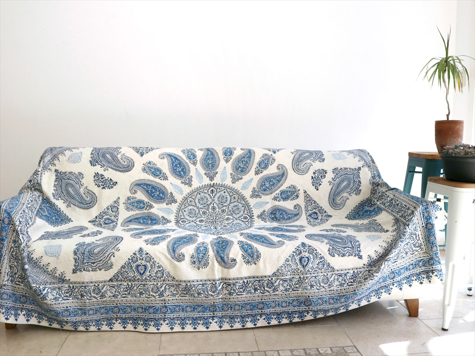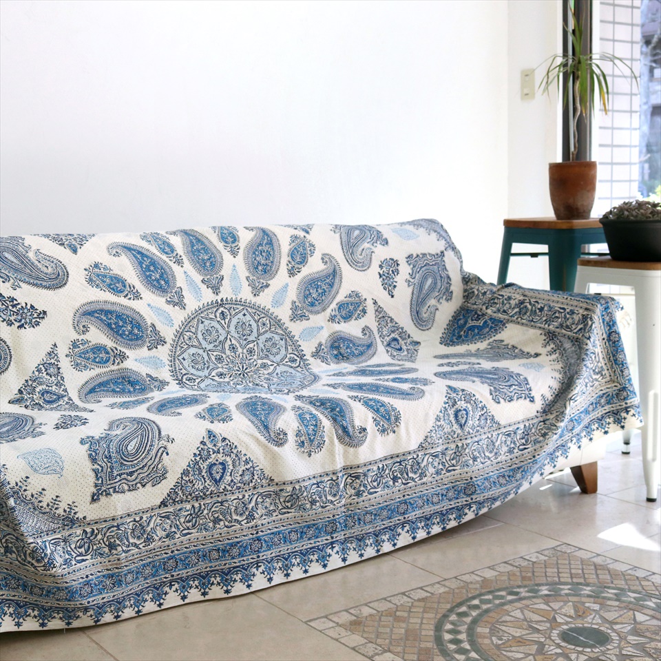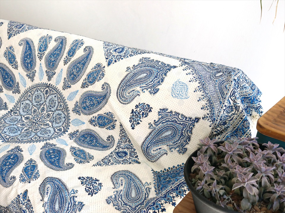 ペルシャ更紗・イラン手染め布/240x160cmサイズ ソファーカバー・テーブルクロス ブルー系ペイズリー柄