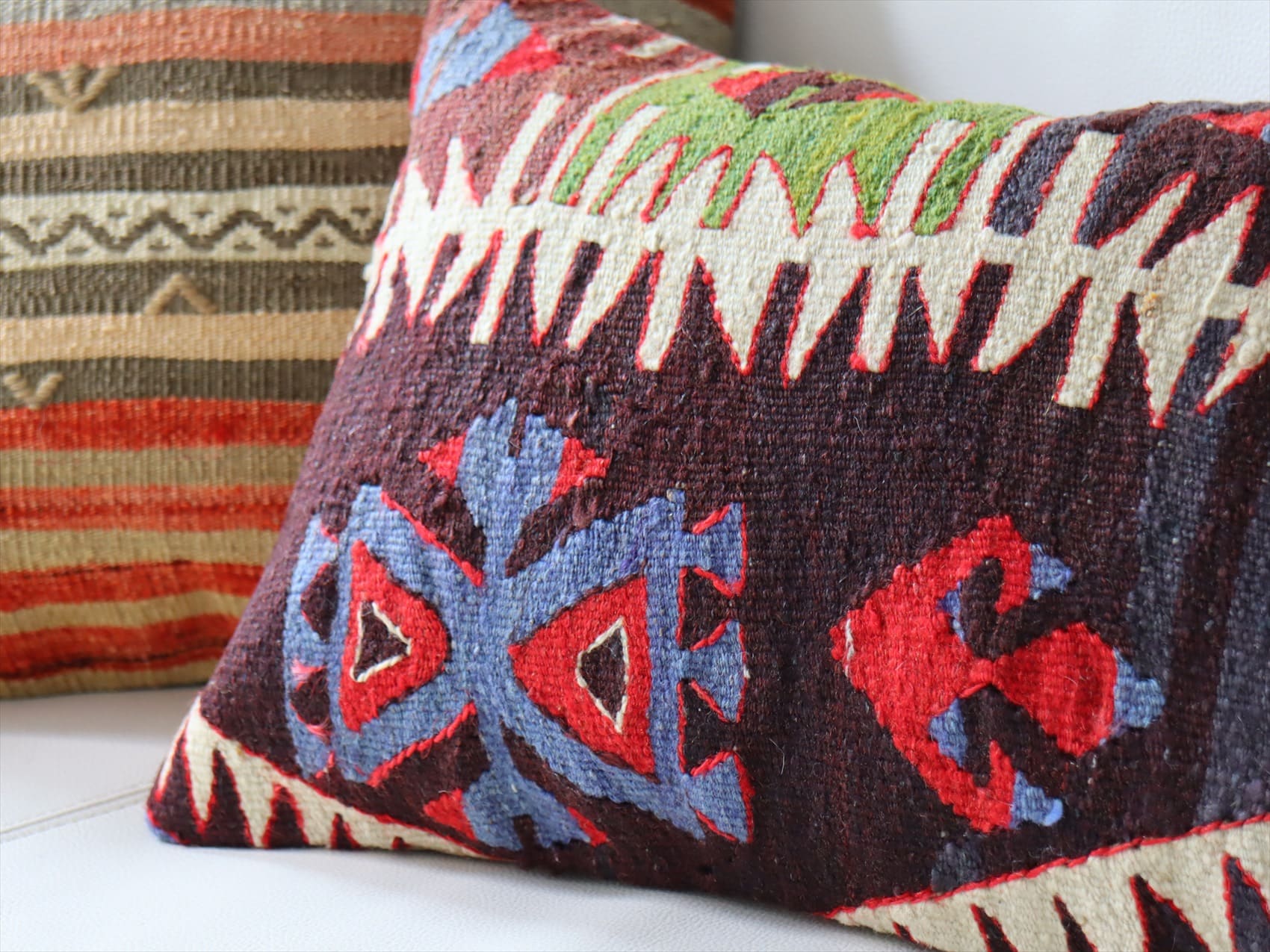 オリジナルのままでは大掛かりな修理が必要だったりするオールドキリムは、カットしてクッションカバーに生まれ変わります。手織りのキリムは全て一点ものなので、そこからカットされたクッションカバーももちろん一点もののアイテムです。