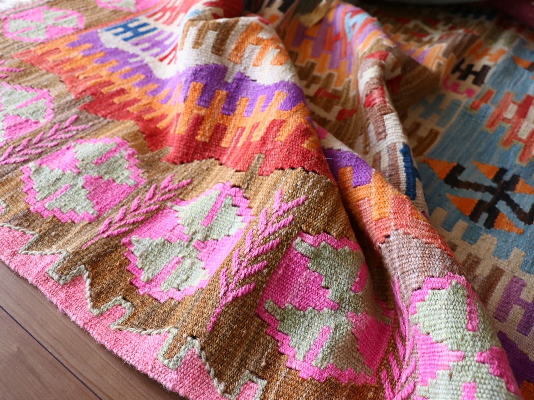 平織りのキリムとしては、やや厚みのある織り地で、5-6mm前後の厚みです。手織りの敷物のため、わずかなゆがみ等ありますことをご了承ください。