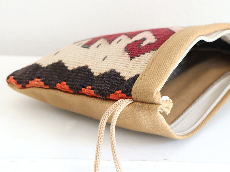 オールドキリムでつくったミニポーチです。表面はキリム、裏面は無地のコットン布を使っています。コスメポーチや小物入れとして使いやすいと思います。