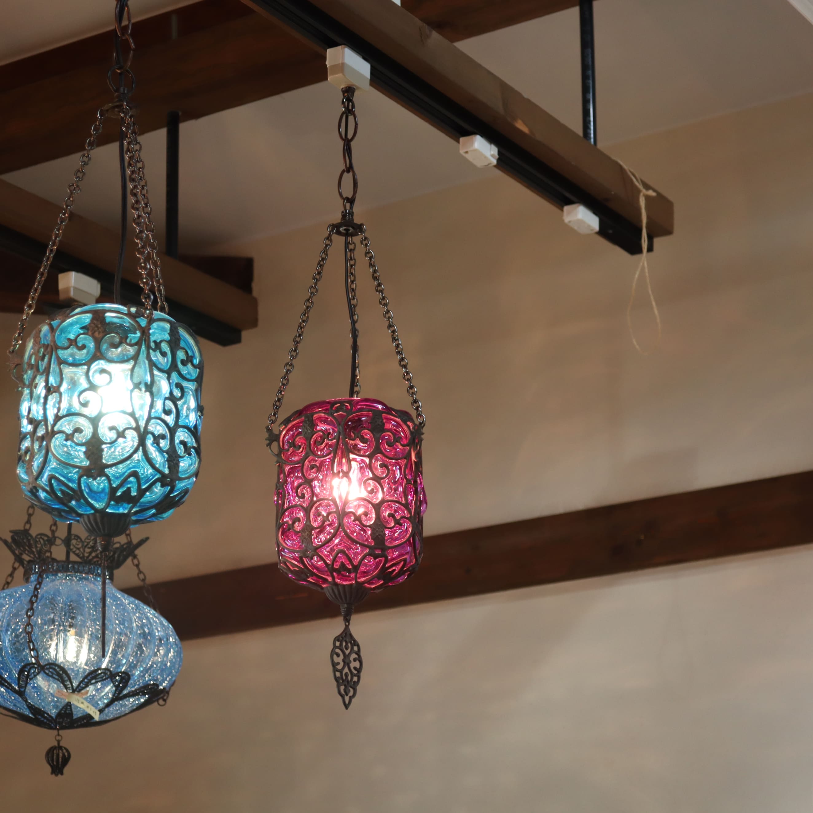 欧風の伝統をアレンジしたロートアイアンの装飾にマウスブローのガラスを吹き付けた重厚なイメージのランプです。