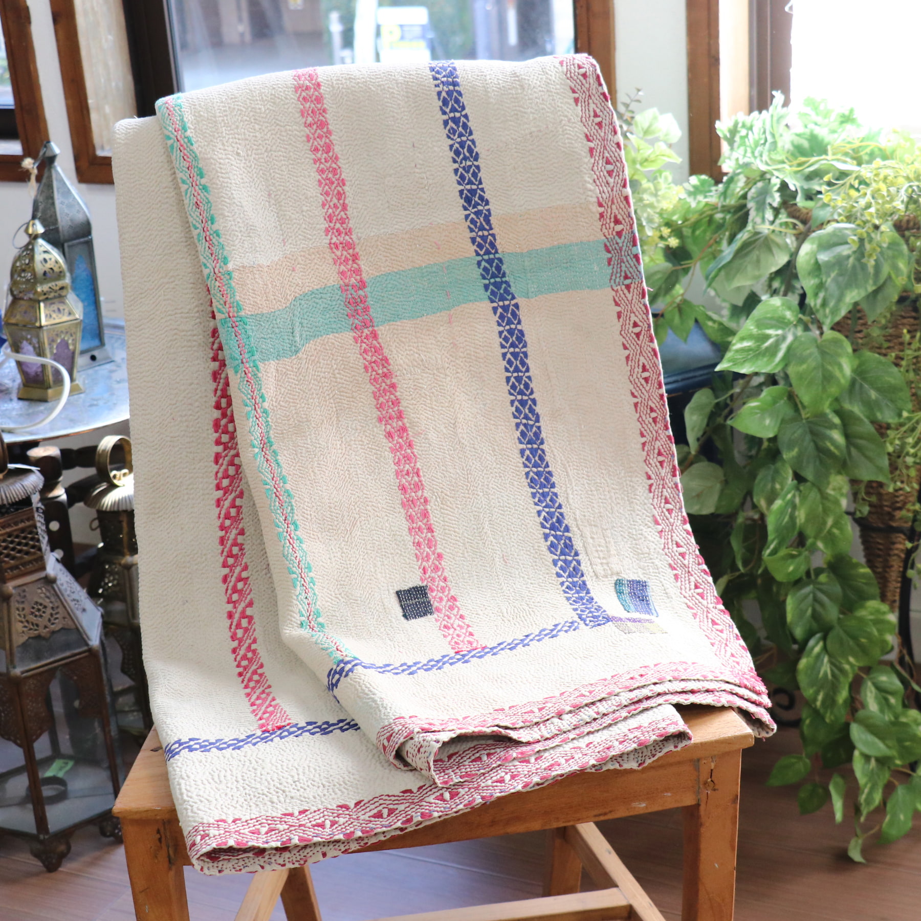 インド カンタ刺繍 ラリーキルト 216×147cm 古布ヴィンテージファブリック 白地コットン