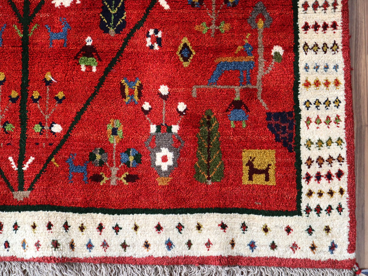 - ギャッベ イランの手織りラグ192×149cm レッド 生命の樹と様々なモチーフ