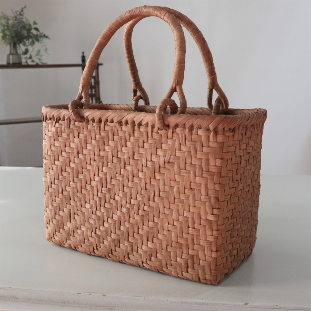こちらの商品は蔓の表面を削って滑らかに仕上げています。山ぶどうのかごバックは、使い込むほどに艶が出て味わい深い質感に変わってゆきます。その変化もお楽しみください。