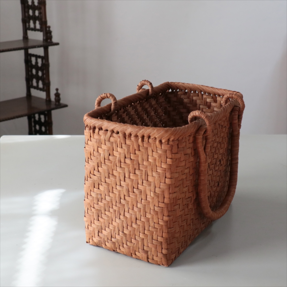しっかりと厚みのある四角い箱のような形のかごバッグです。リング手は座って膝にのせた時などに折りたためて、持ち手がじゃまにならず使いやすいのでおすすめです。