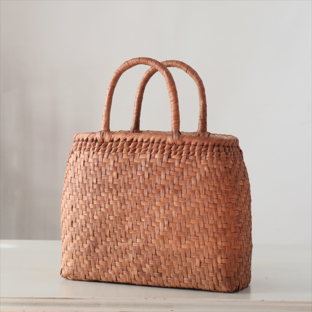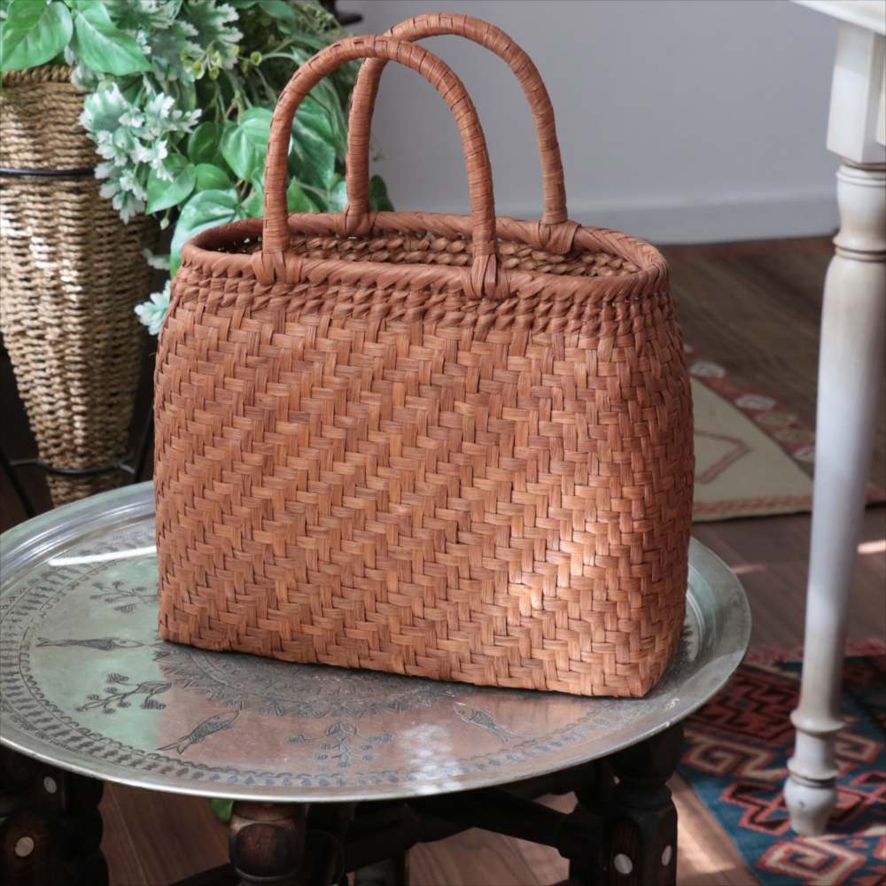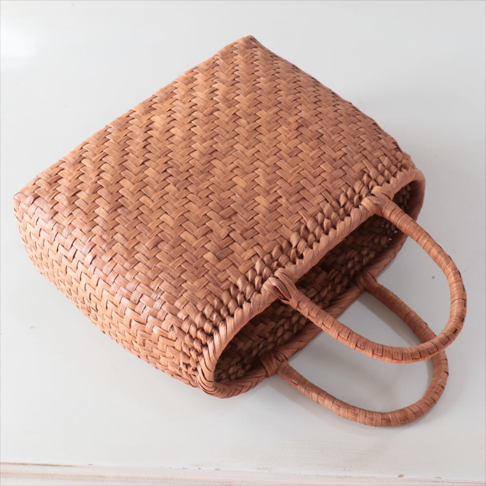 まるみのあるきれいなラインのカゴバッグ。シンプルな網代編みです。高さがあってマチも広めなので、普段使いに活躍できるかごバッグです。やまぶどうの蔓の表面を削って整え、滑らかに仕上げています。山ぶどうのかごバックは、最初は少し赤みのある明るい茶色で、使い込むほどに艶が出てこげ茶色の味わい深い質感に変わってゆきます。その変化もお楽しみください。